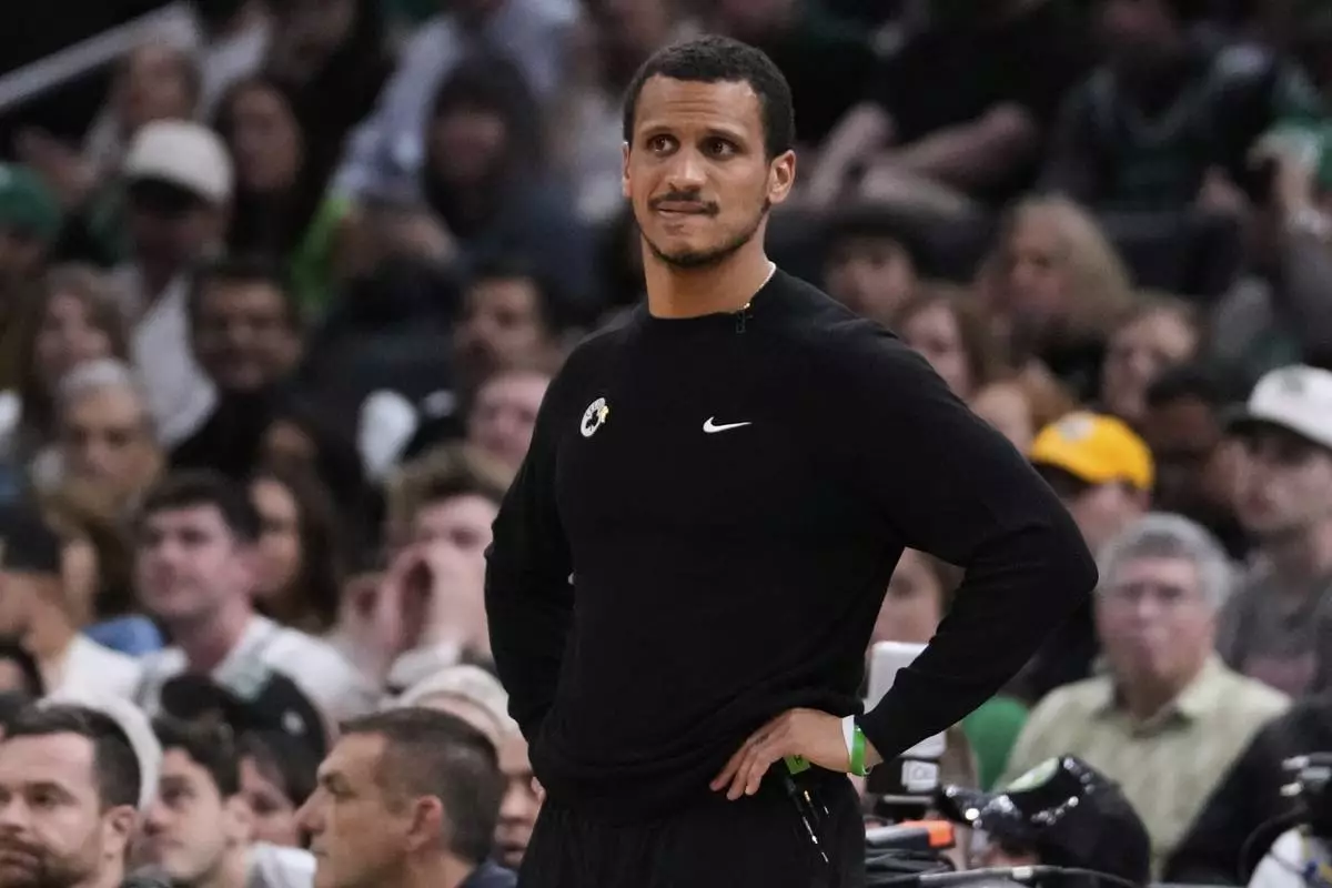 Boston Celtics head coach Joe Mazzulla watches his players during the first half in game 5 of a first-round NBA playoff basketball series against the Boston Celtics, Tuesday, April 29, 2025, in Boston. (AP Photo/Charles Krupa)