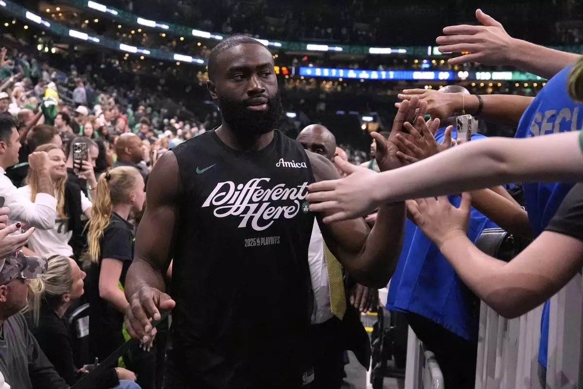 Boston Celtics guard Jaylen Brown is congratulated by fans after eliminating the Orlando Magic following the second half in game 5 of a first-round NBA playoff basketball series, Tuesday, April 29, 2025, in Boston. (AP Photo/Charles Krupa)
