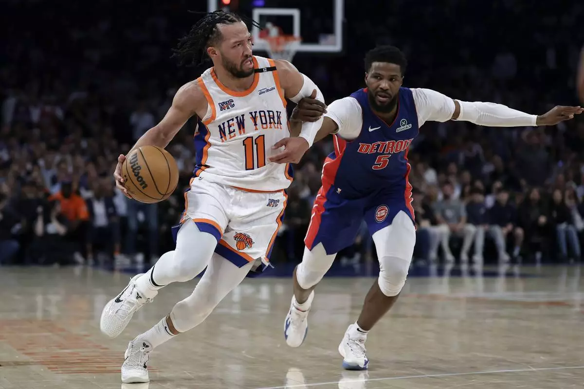 New York Knicks guard Jalen Brunson (11) drives past Detroit Pistons guard Malik Beasley in the second half during Game 5 in an NBA basketball first-round playoff series Tuesday, April 29, 2025, in New York. (AP Photo/Adam Hunger)