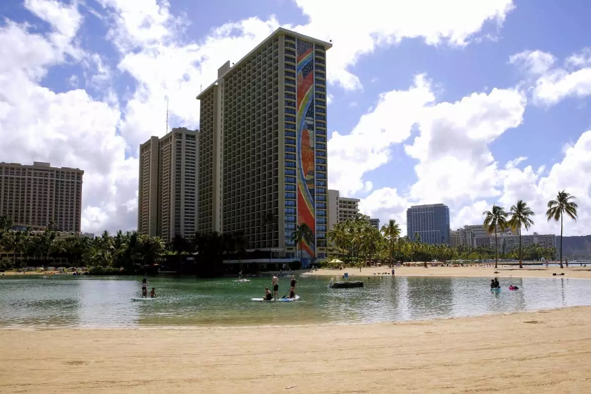 FILE - People swim in the lagoon in front of the Hilton Hawaiian Village resort in Honolulu on Saturday, Sept. 4, 2021. (AP Photo/Caleb Jones, File)