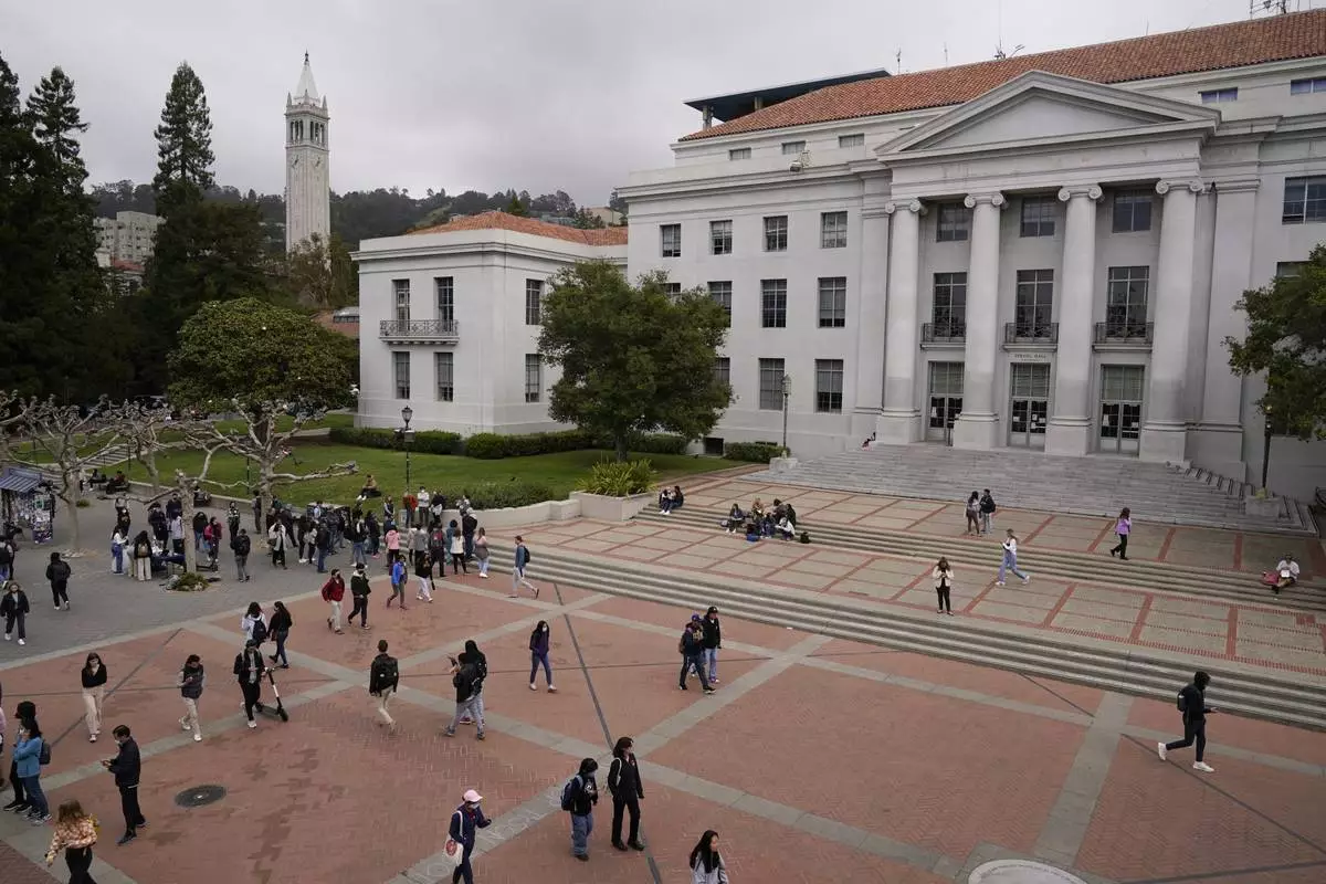 FILE - Students walk through Sproul Plaza on the University of California, Berkeley campus on March 29, 2022, in Berkeley, Calif. (AP Photo/Eric Risberg, File)