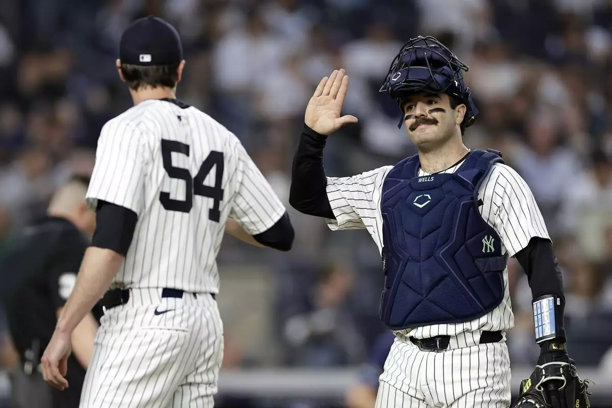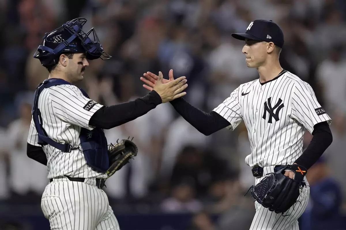 New York Yankees pitcher Luke Weaver, right, and catcher Austin Wells, left, celebrate after a baseball game against the Tampa Bay Rays, Friday, May 2, 2025, in New York. (AP Photo/Adam Hunger)