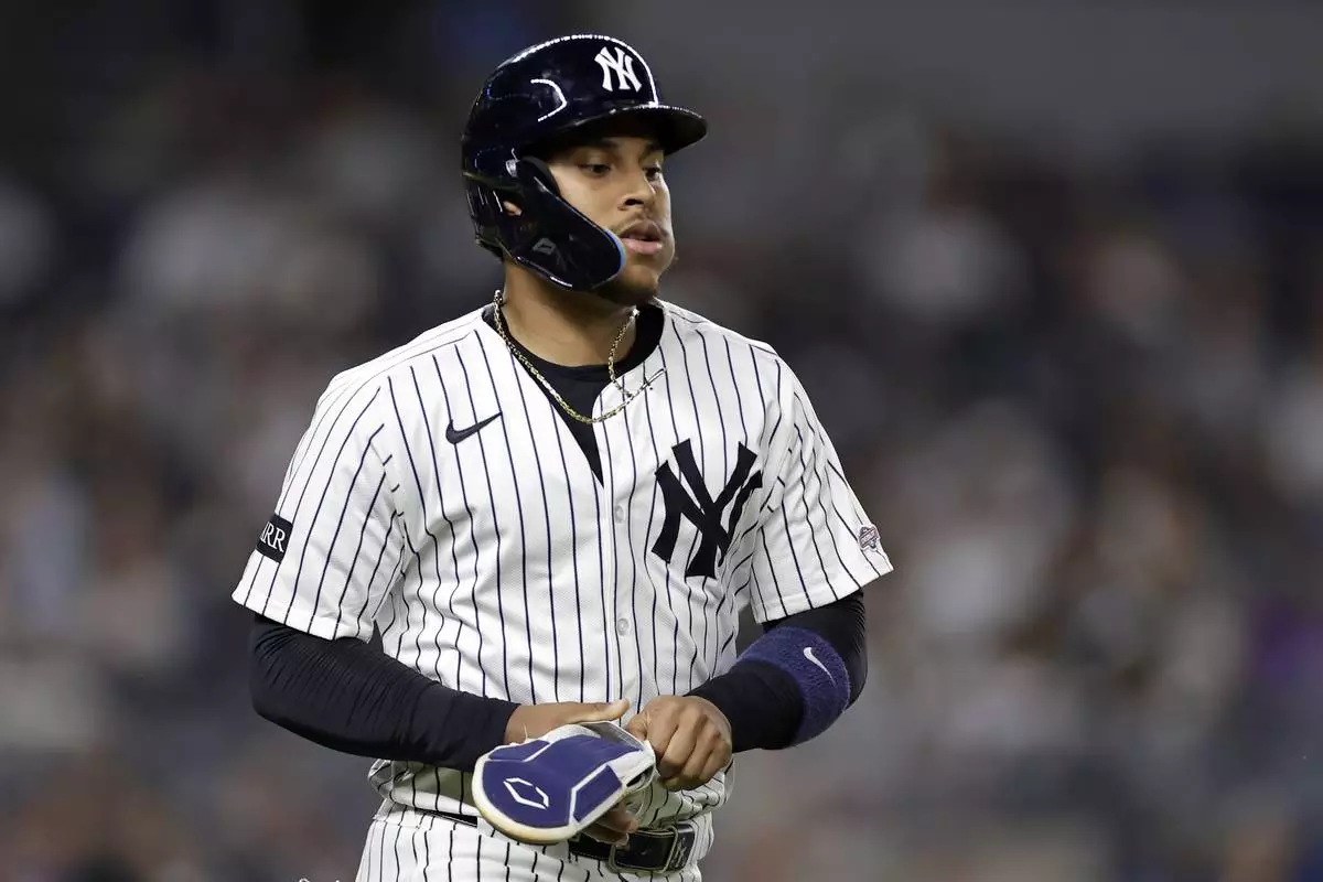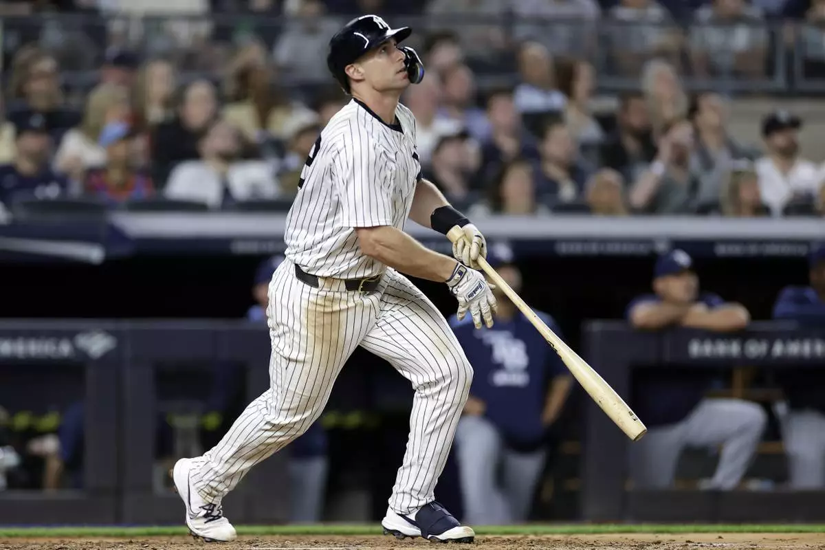 New York Yankees' Jorbit Vivas reacts after being walked during the fifth inning of a baseball game against the Tampa Bay Rays, Friday, May 2, 2025, in New York. (AP Photo/Adam Hunger)
