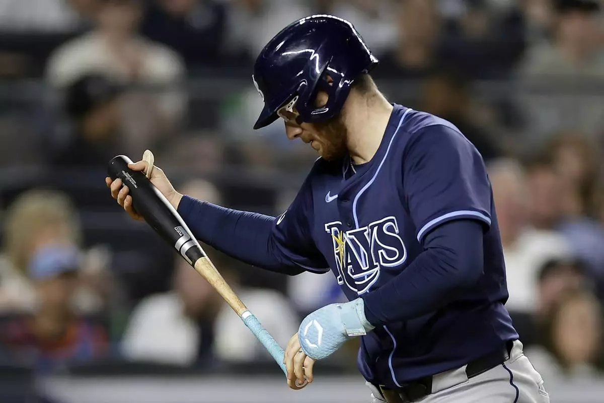 Tampa Bay Rays' Danny Jansen reacts after striking out during the eighth inning of a baseball game against the New York Yankees, Friday, May 2, 2025, in New York. (AP Photo/Adam Hunger)