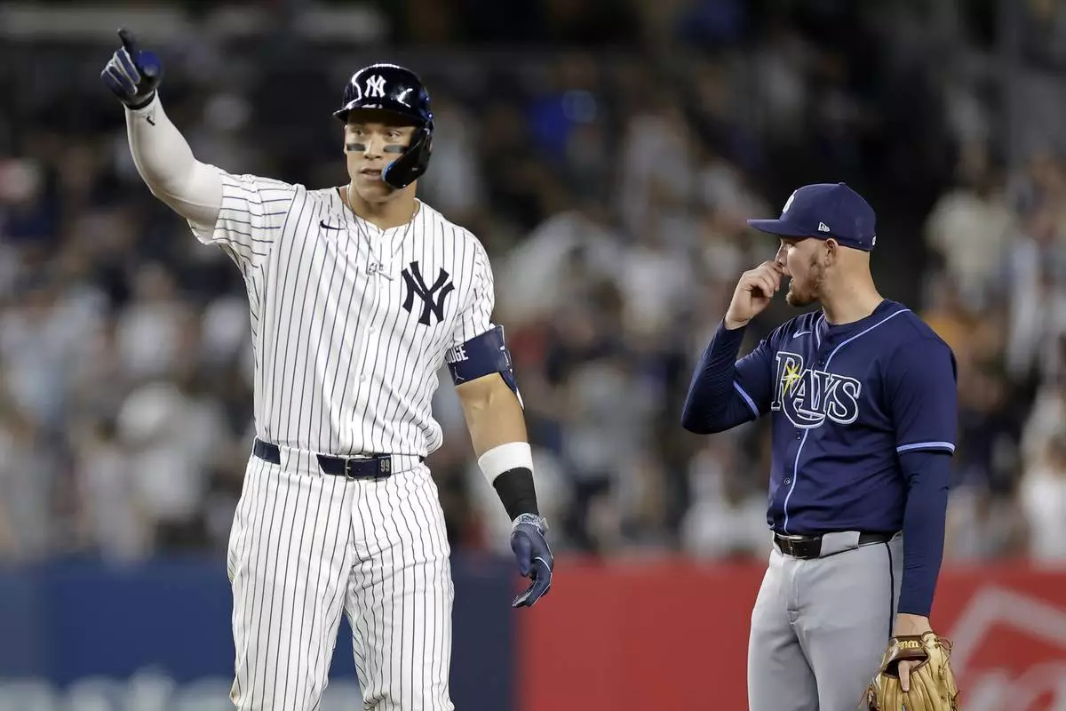 New York Yankees' Aaron Judge, left, reacts next to Tampa Bay Rays first baseman Curtis Mead after hitting a double during the fifth inning of a baseball game Friday, May 2, 2025, in New York. (AP Photo/Adam Hunger)