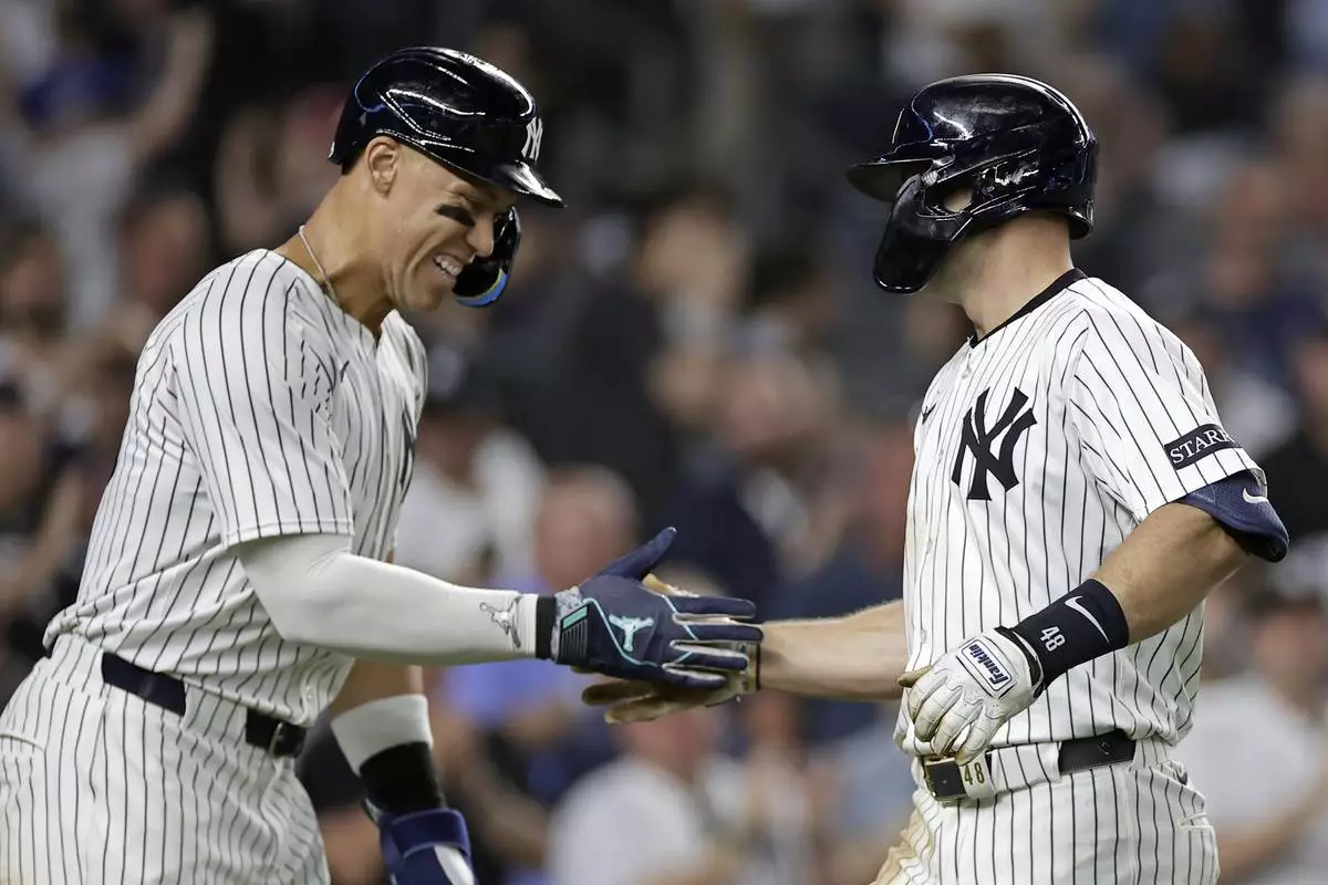New York Yankees' Paul Goldschmidt is congratulated by Aaron Judge, left, after hitting a three-run home run during the fifth inning of a baseball game against the Tampa Bay Rays, Friday, May 2, 2025, in New York. (AP Photo/Adam Hunger)