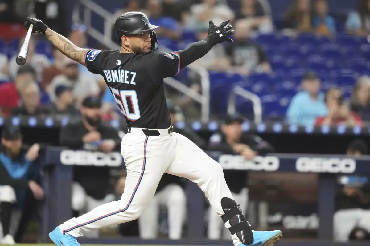 Miami Marlins' Agustín Ramírez (50) follows through on a double during the fourth inning of a baseball game against the Oakland Athletics, Friday, May 2, 2025, in Miami. (AP Photo/Lynne Sladky)