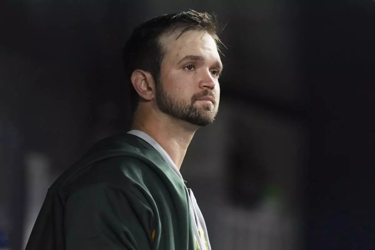 Oakland Athletics starting pitcher Gunnar Hoglund looks from the dugout after pitching in the fifth inning of a baseball game against the Miami Marlins, Friday, May 2, 2025, in Miami. (AP Photo/Lynne Sladky)