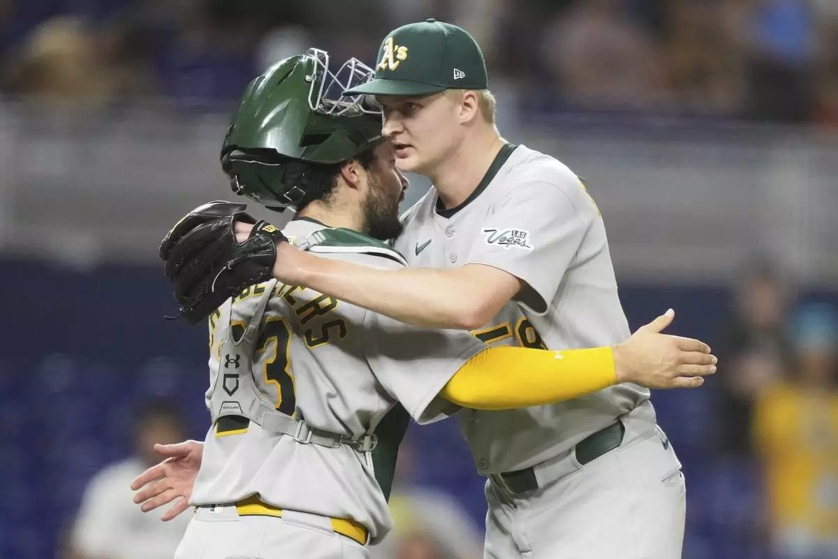 Oakland Athletics catcher Shea Langeliers (23) and relief pitcher Noah Murdock, right, embrace after defeating the Miami Marlins in a baseball game, Friday, May 2, 2025, in Miami. (AP Photo/Lynne Sladky)
