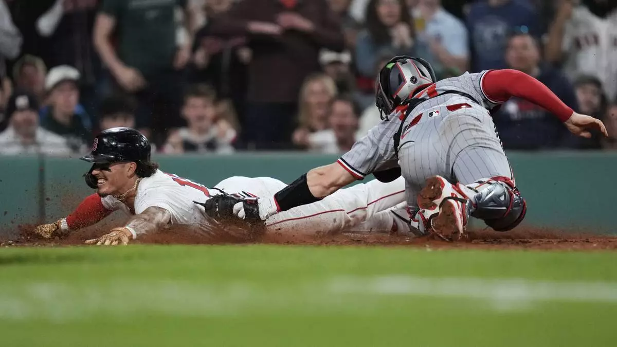 Boston Red Sox's Jarren Duran, left, is tagged out by Minnesota Twins catcher Ryan Jeffers, right, during the eighth inning of a baseball game at Fenway Park, Friday, May 2, 2025, in Boston. (AP Photo/Charles Krupa)