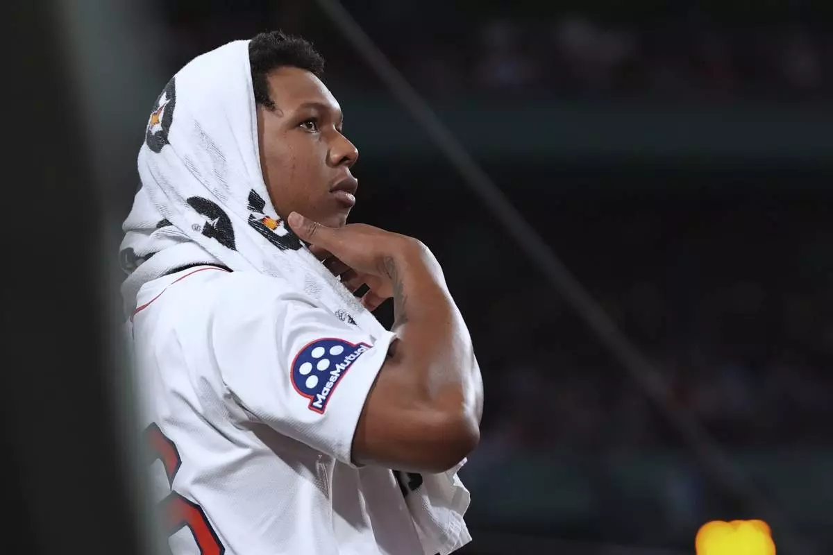 Boston Red Sox starting pitcher Brayan Bello watches from the dugout during the seventh inning of a baseball game against the Minnesota Twins at Fenway Park, Friday, May 2, 2025, in Boston. (AP Photo/Charles Krupa)