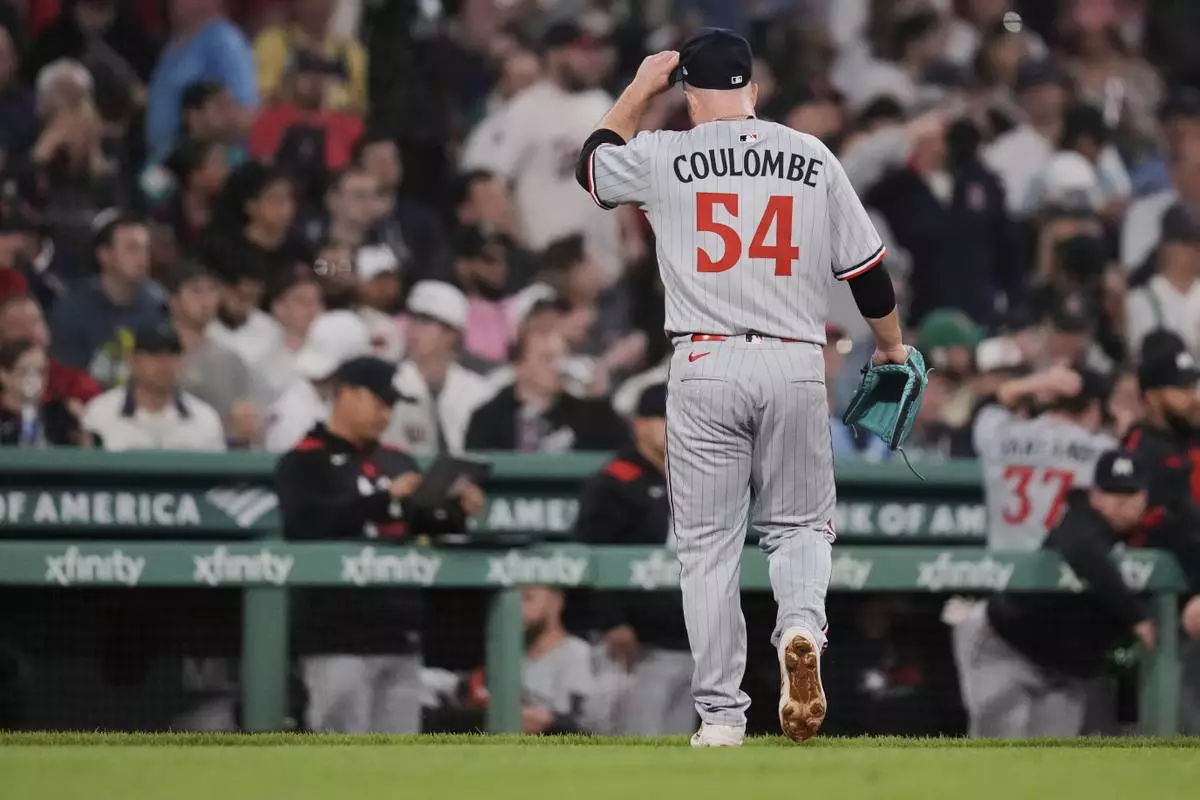 Minnesota Twins pitcher Danny Coulombe heads to the dugout during the seventh inning of a baseball game against the Boston Red Sox at Fenway Park, Friday, May 2, 2025, in Boston. (AP Photo/Charles Krupa)