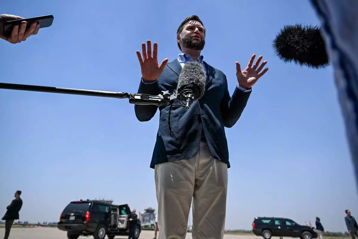 U.S. Vice President JD Vance speaks to media as he departs Agra, India en route to Jaipur, India after visiting the Taj Mahal on Wednesday, April 23, 2025, in Agra, India. (Kenny Holston/The New York Times via AP, Pool)