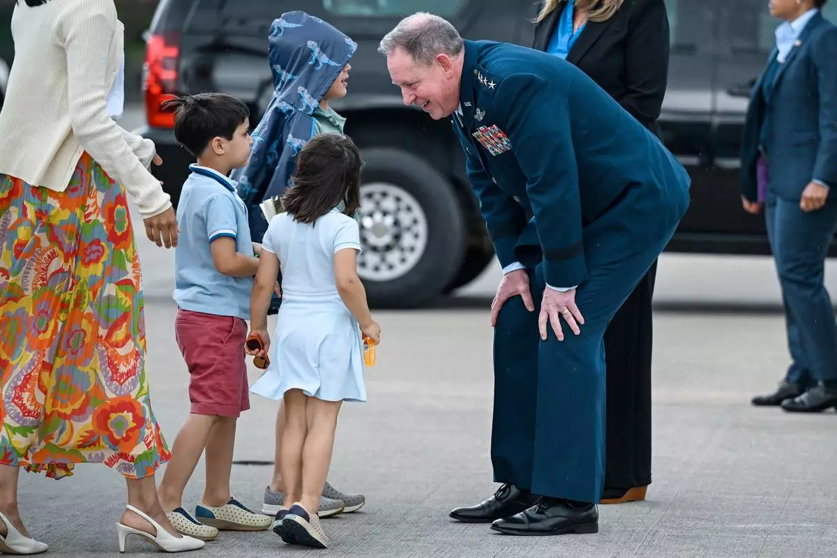 U.S. Air Force General James Hecker leans down to talk with U.S. Vice President JD Vance's children prior to Vance and his family departing Ramstein Air Base, Germany, Thursday April 24, 2025. (Kenny Holston/Pool Photo via AP)