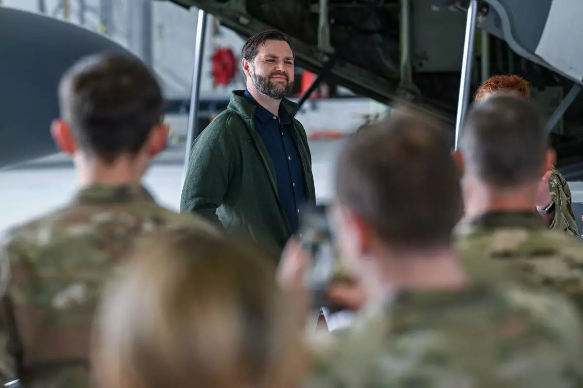 U.S. Vice President JD Vance visits with service members during a refueling stop at Ramstein Air Base,, Germany, Thursday April 24, 2025. (Kenny Holston/Pool Photo via AP)