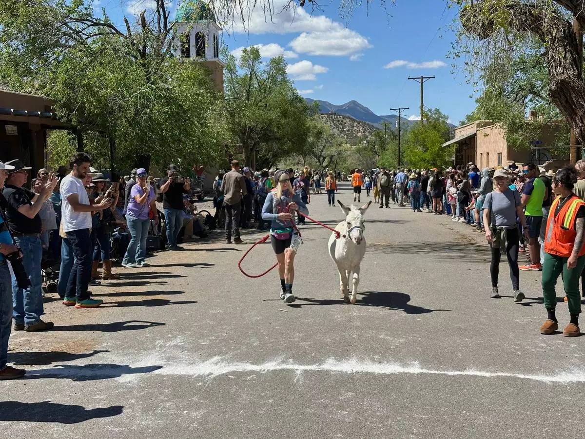 People look on as Pack burros and their human companions race through the streets of a former mining town and across backcountry desert trails in Cerrillos, N.M., on Saturday, May 3, 2025. (AP Photo/Morgan Lee)