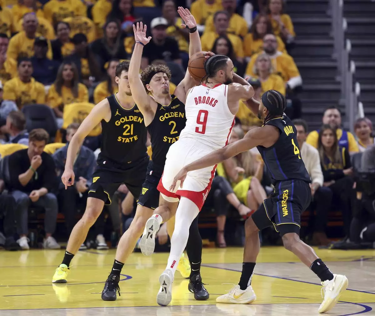 Golden State Warriors' Brandin Podziemskli (2) and Moses Moody (4) defend against Houston Rockets' Dillon Brooks (9) in the first quarter of Game 6 of an NBA basketball first-round playoff series Friday, May 2, 2025, in San Francisco. (Scott Strazzante/San Francisco Chronicle via AP)