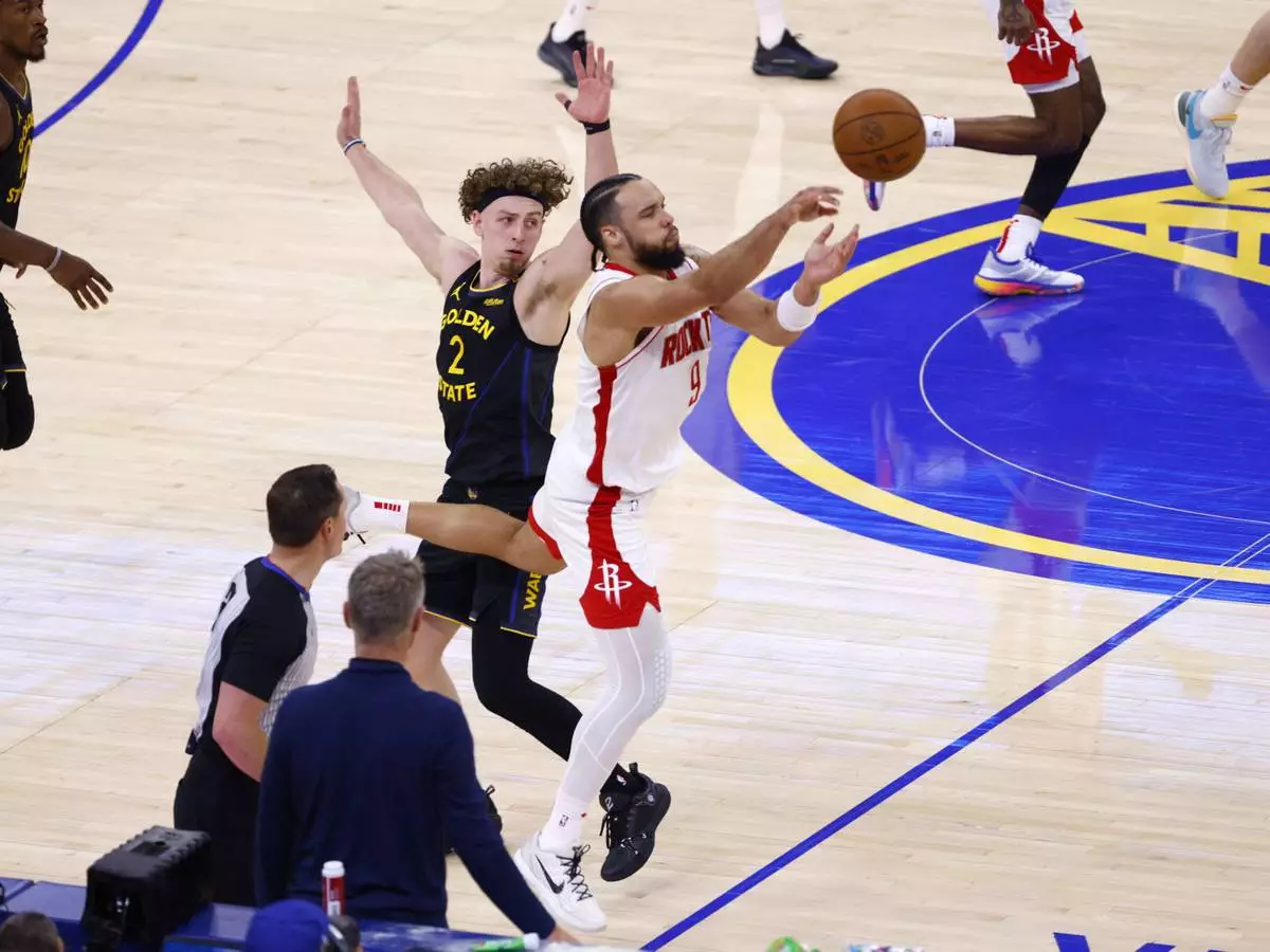 Houston Rockets forward Dillon Brooks (9) passes the ball while guarded by Golden State Warriors guard Brandin Podziemski (2) in the second quarter of Game 6 of an NBA basketball first-round playoff series Friday, May 2, 2025, in San Francisco. (Santiago Mejia/San Francisco Chronicle via AP)