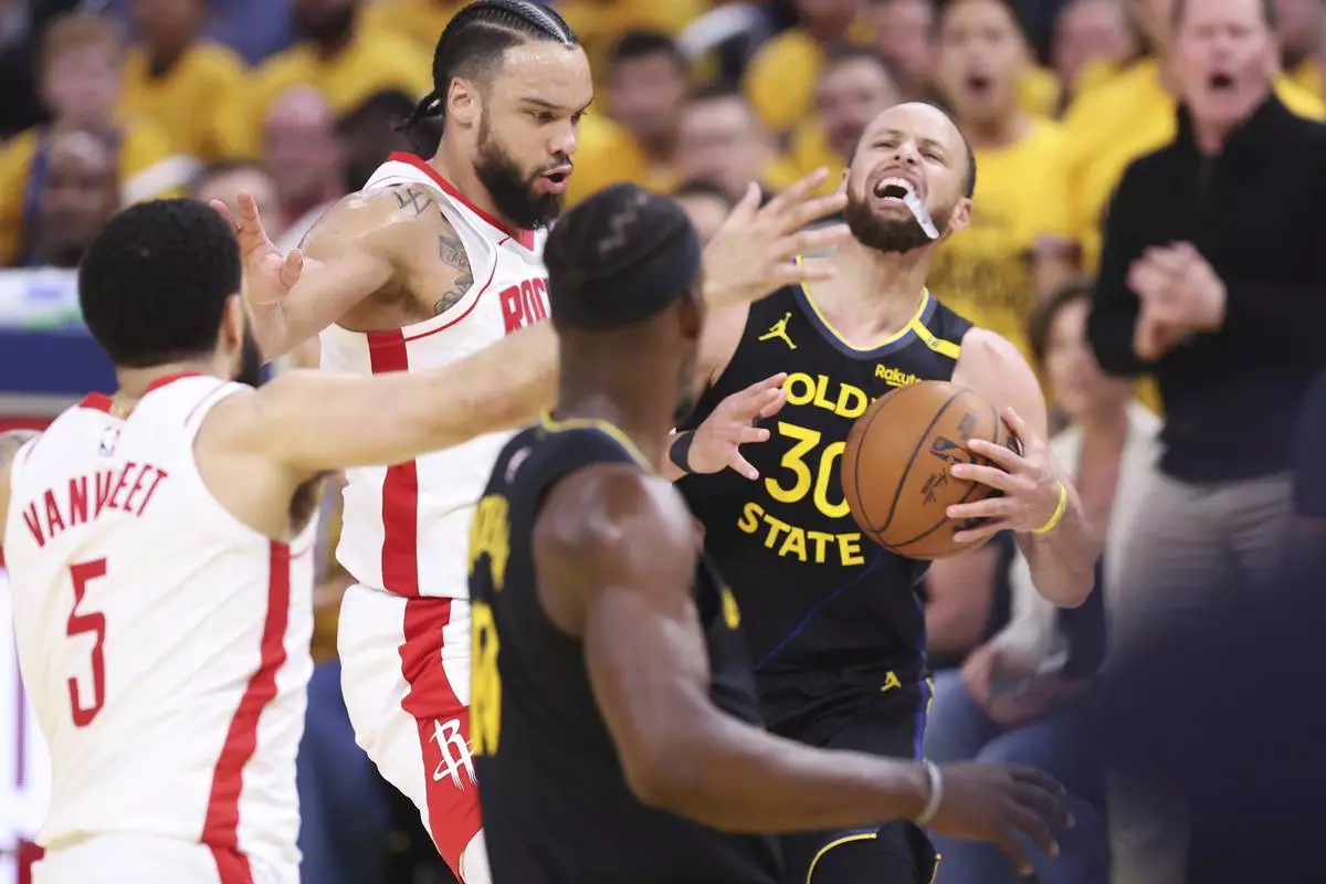 Golden State Warriors' Stephen Curry (30) is fouled by Houston Rockets' Fred VanVleet, right, in the first quarter of Game 6 of an NBA basketball first-round playoff series Friday, May 2, 2025, in San Francisco. (Scott Strazzante/San Francisco Chronicle via AP)