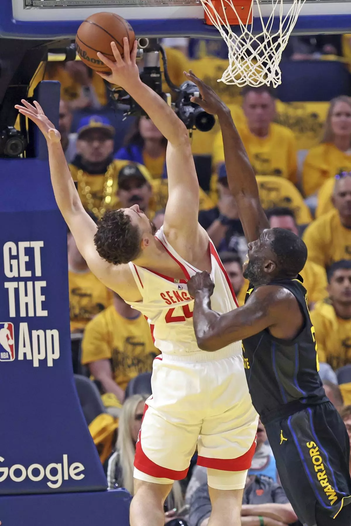Golden State Warriors' Draymond Green, right, cannot stop Houston Rockets' Alperen Sengun, left, from scoring in the first quarter of Game 6 of an NBA basketball first-round playoff series Friday, May 2, 2025, in San Francisco. (Scott Strazzante/San Francisco Chronicle via AP)