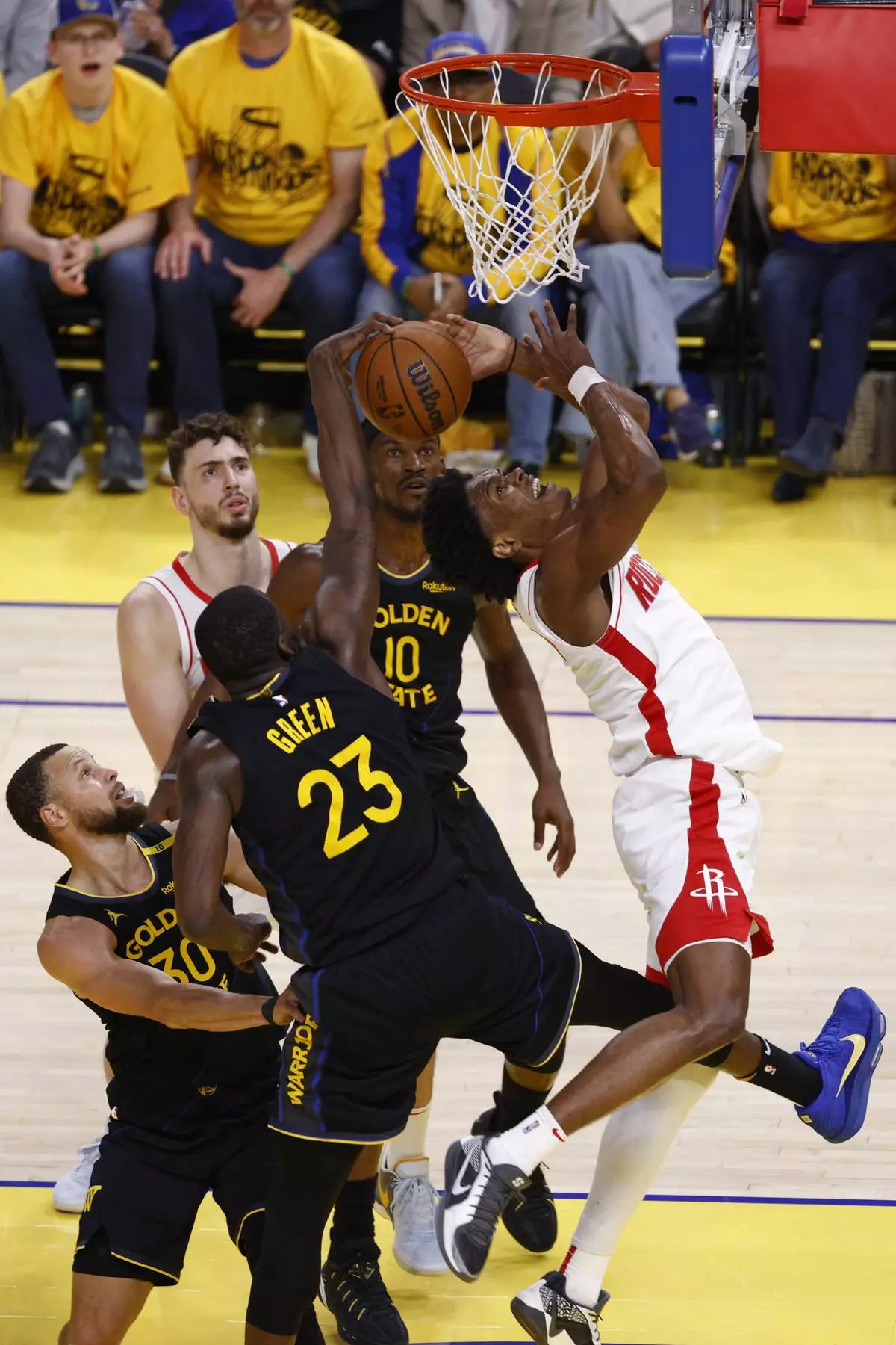 Houston Rockets forward Amen Thompson, right, is blocked by Golden State Warriors forward Draymond Green (23) in the second quarter of Game 6 of an NBA basketball first-round playoff series Friday, May 2, 2025, in San Francisco. (Santiago Mejia/San Francisco Chronicle via AP)