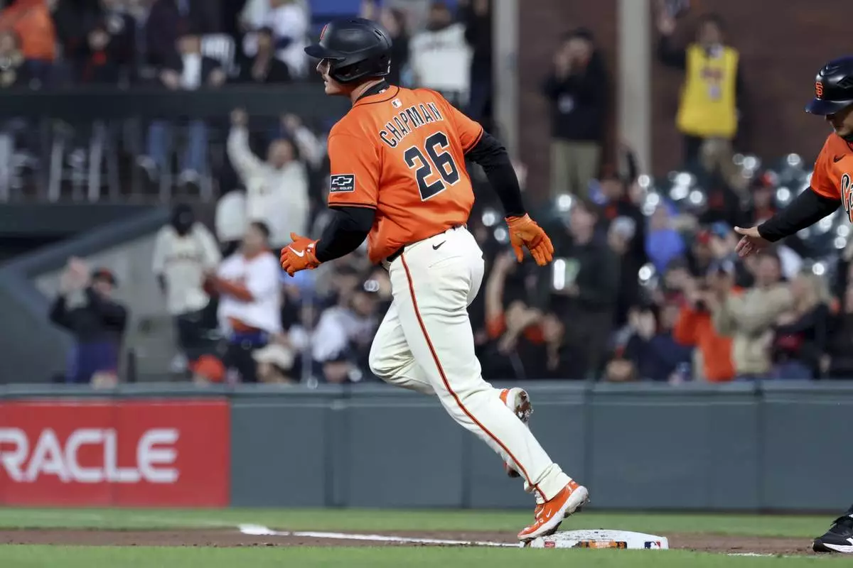 San Francisco Giants' Matt Chapman (26) rounds the bases after hitting a home run against the Colorado Rockies during the third inning of a baseball game in San Francisco, Friday, May 2, 2025. (AP Photo/Jed Jacobsohn)