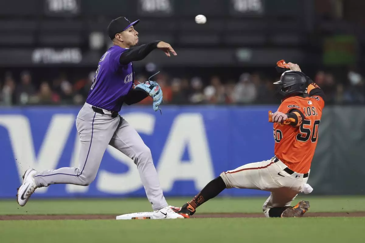Colorado Rockies' Alan Trejo, left, throws to first base as San Francisco Giants' Christian Koss (50) slides into second base on a double play hit into by Mike Yastrzemski during the fourth inning of a baseball game in San Francisco, Friday, May 2, 2025. (AP Photo/Jed Jacobsohn)