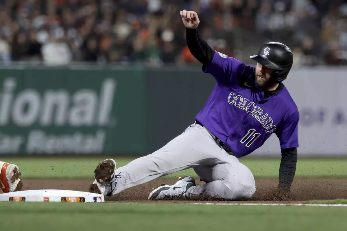 Colorado Rockies' Owen Miller slides into third on a single hit by Jordan Beck during the sixth inning of a baseball game against the San Francisco Giants in San Francisco, Friday, May 2, 2025. (AP Photo/Jed Jacobsohn)