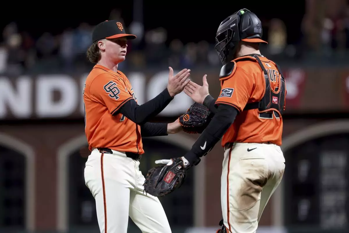 San Francisco Giants pitcher Hayden Birdsong (60) celebrates with catcher Sam Huff (23) after defeating the Colorado Rockies during a baseball game in San Francisco, Friday, May 2, 2025. (AP Photo/Jed Jacobsohn)