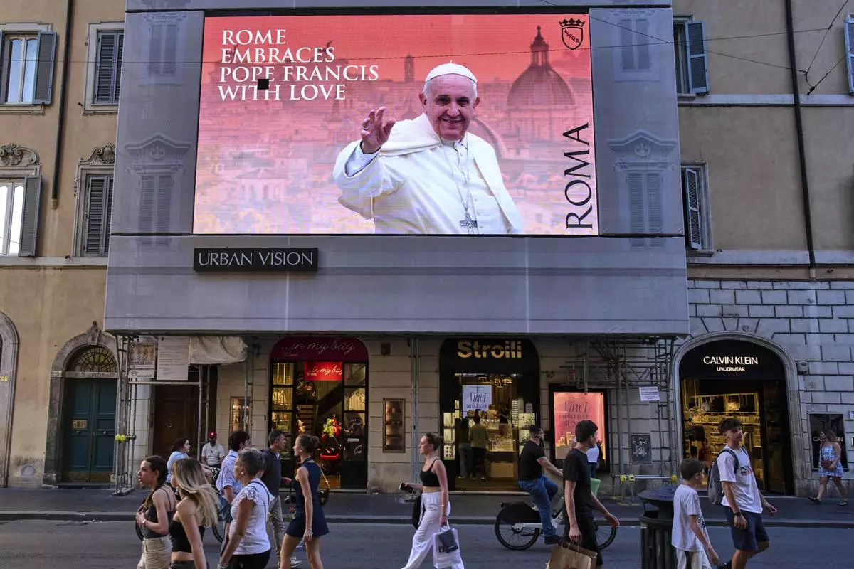 A street screen dedicated to Pope Francis reads "Rome hugs Francis with Love" in downtown Rome, Friday, May 2, 2025. (AP Photo/Bernat Armangue)