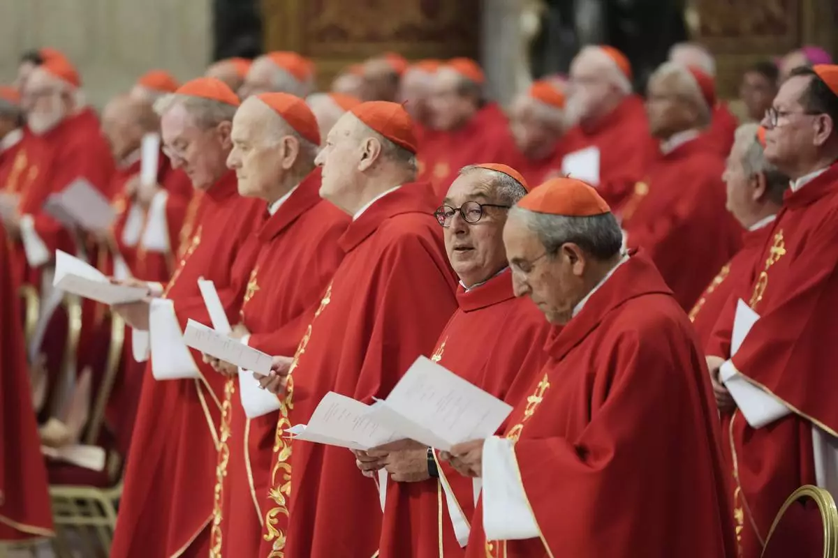 Cardinals attend a mass on the fifth of nine days of mourning for late Pope Francis, in St. Peter's Basilica at the Vatican, Wednesday, April 30, 2025. (AP Photo/Alessandra Tarantino)