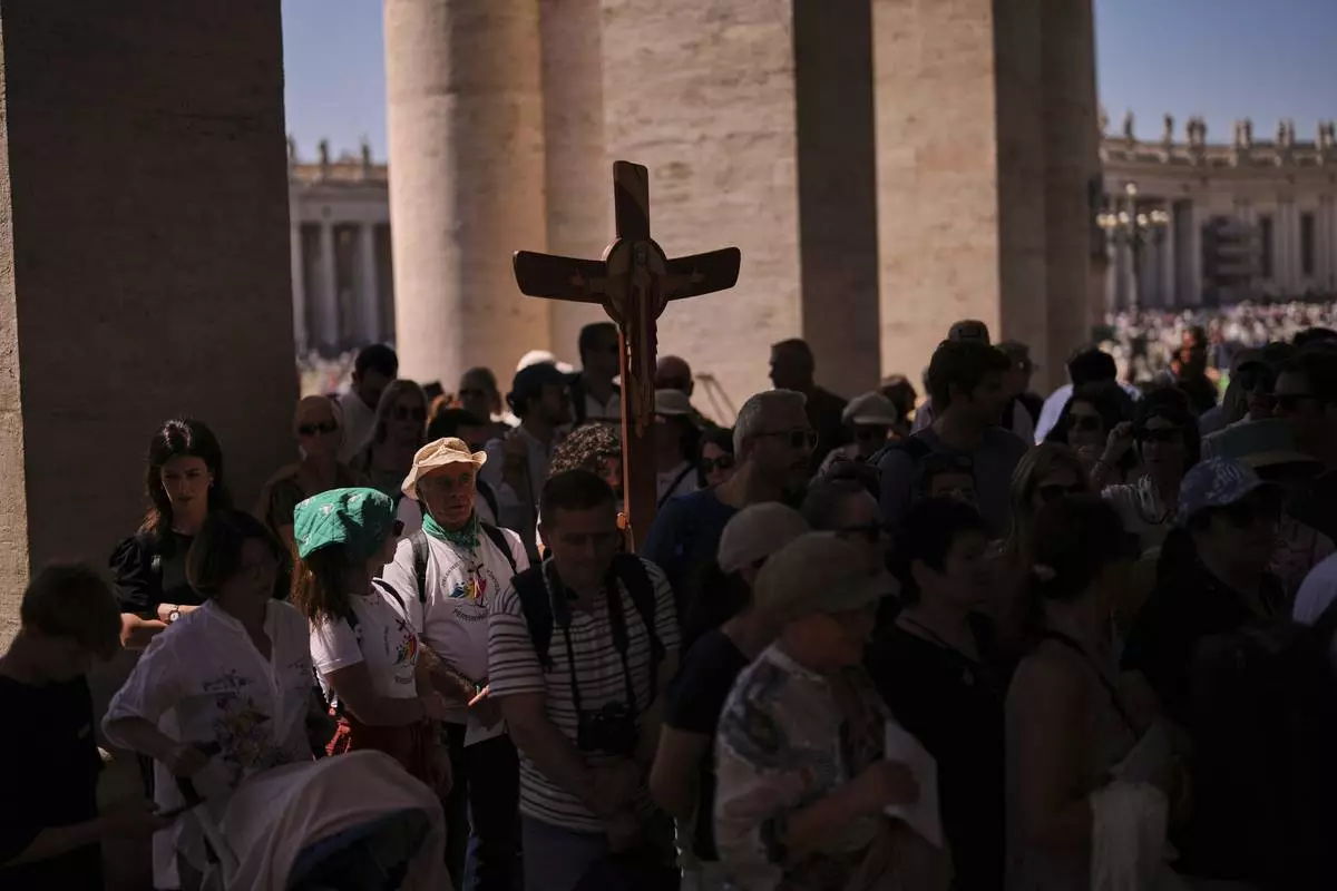 Pilgrims arrive to visit St. Peter's Basilica on the seventh of nine days of mourning for late Pope Francis, at the Vatican, Friday, May 2, 2025. (AP Photo/Francisco Seco)