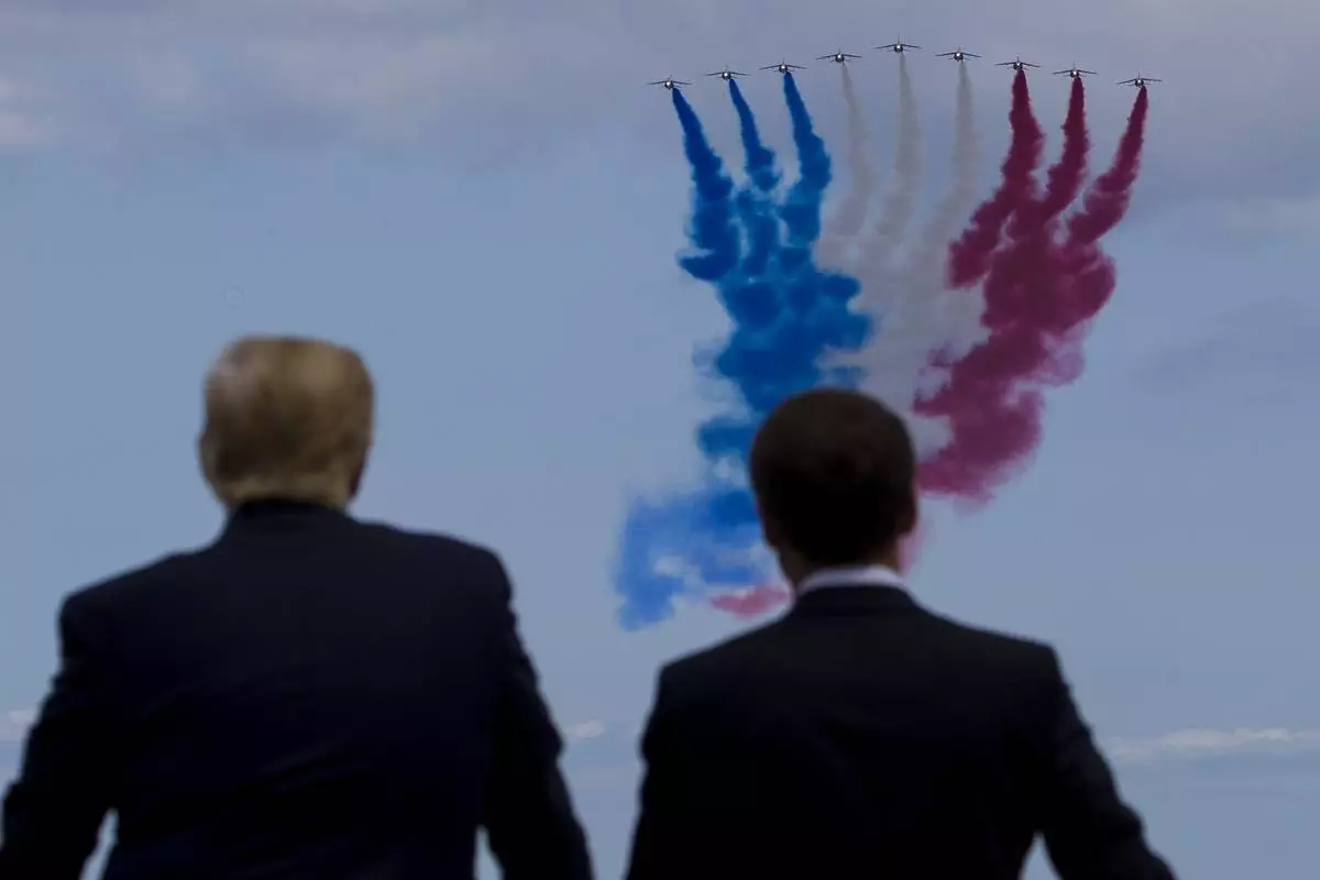 FILE - President Donald Trump, left, and French President Emmanuel Macron watch a flyover during a ceremony to commemorate the 75th anniversary of D-Day at the American Normandy cemetery, June 6, 2019, in Colleville-sur-Mer, Normandy, France. (AP Photo/Alex Brandon, File)
