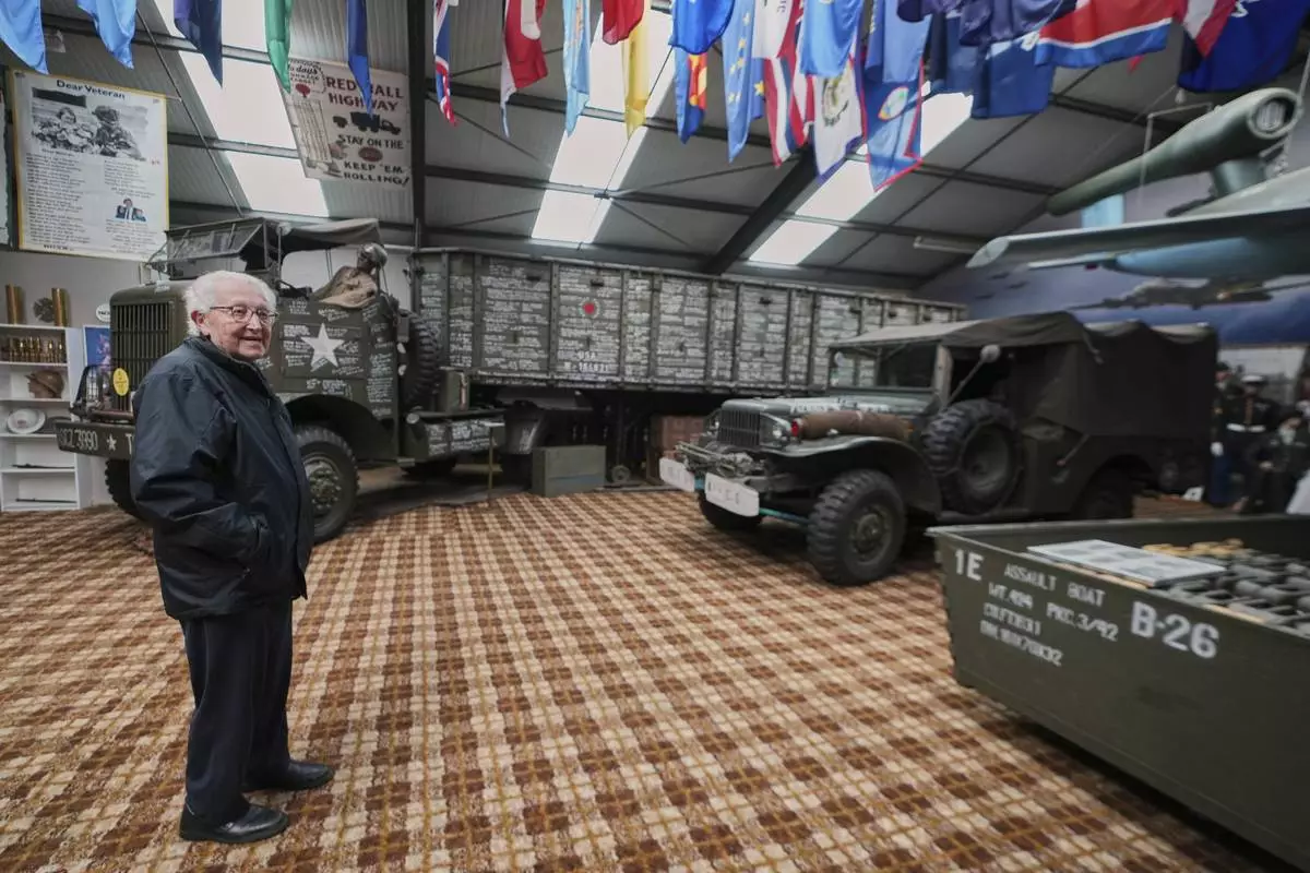 Director of the WWII Remember Museum 1939-1945, Marcel Schmetz, stands near vintage WWII vehicles inside his museum in Thimister-Clermont, Belgium, April 22, 2025. (AP Photo/Virginia Mayo)