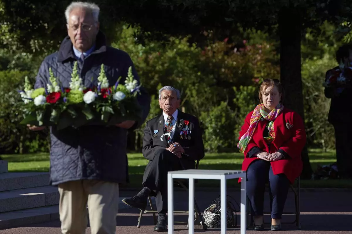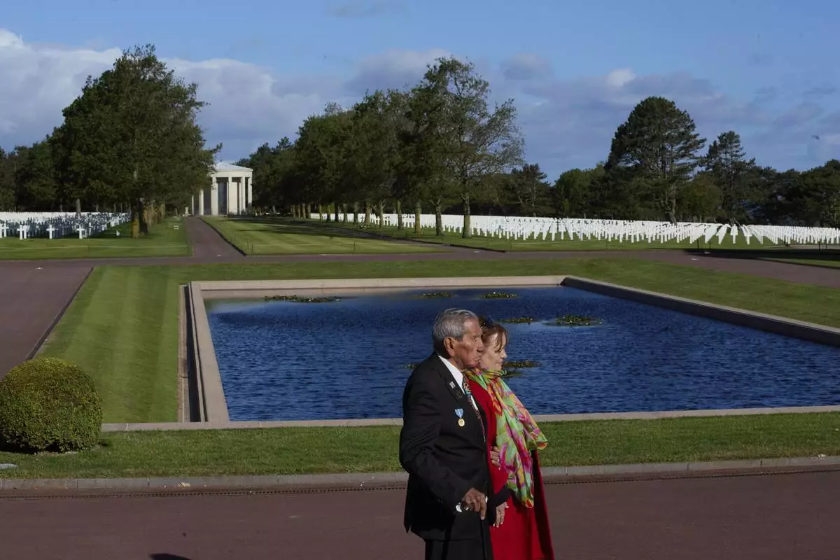 World War II D-Day veteran and Penobscot Elder from Maine, Charles Norman Shay, center, and Marie Pacale Legrand during a D-Day 76th anniversary ceremony at the Normandy American Cemetery in Colleville-sur-Mer, Normandy, France, June 6, 2020. (AP Photo/Virginia Mayo)
