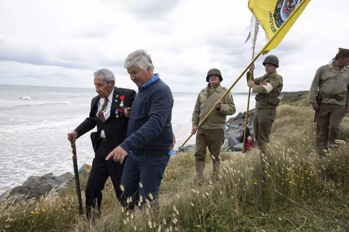 FILE- World War II D-Day veteran and Penobscot Elder from Maine, Charles Norman Shay, poses on the dune overlooking Omaha Beach prior to a ceremony at his memorial in Saint-Laurent-sur-Mer, Normandy, France, June 5, 2020. (AP Photo/Virginia Mayo, File)