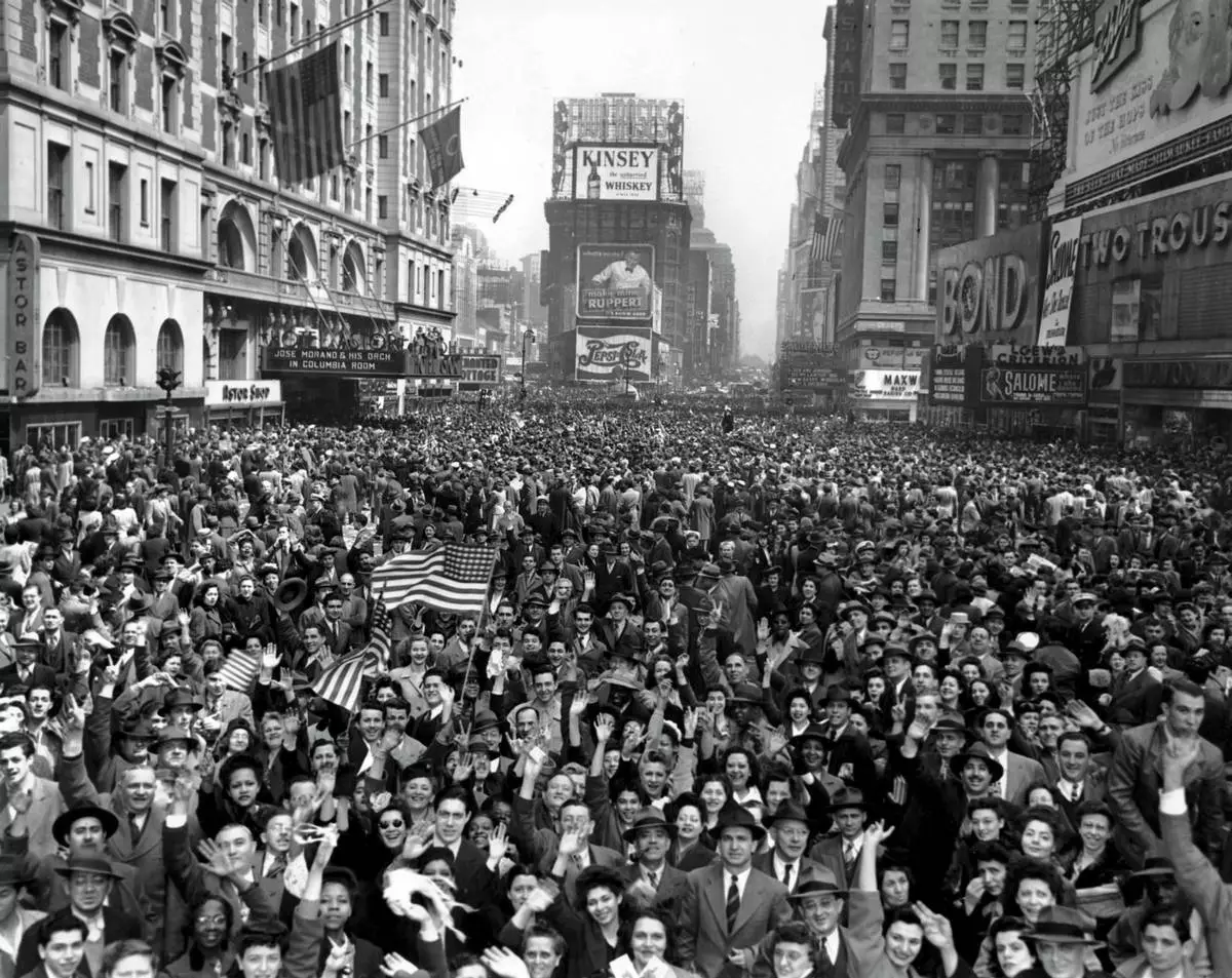 FILE - Looking north from 44th Street, New York's Times Square is packed Monday, May 7, 1945, with crowds celebrating the news of Germany's unconditional surrender in World War II. (AP Photo/Tom Fitzsimmons, File)