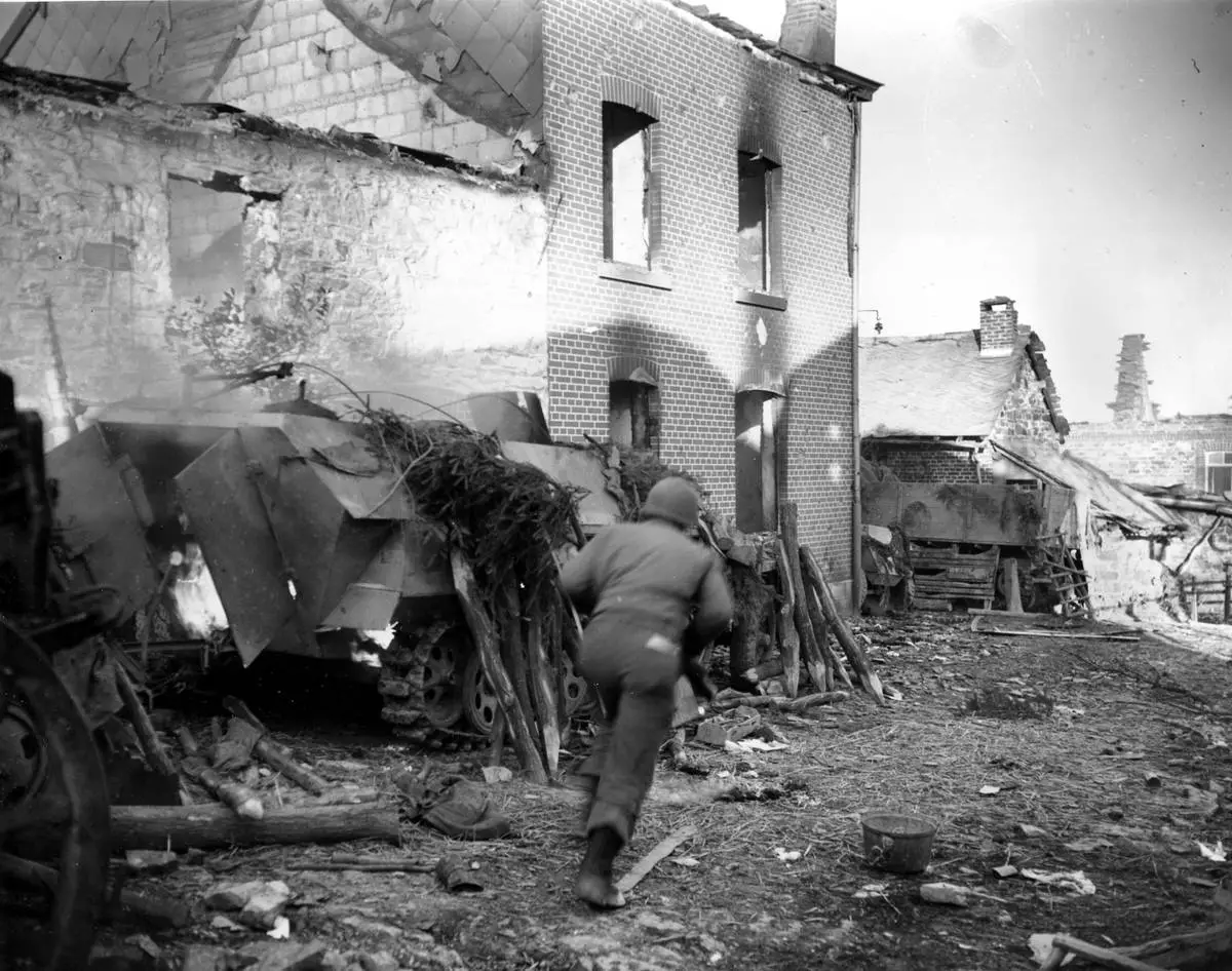 FILE - An American soldier runs past a burning German half-track in the recaptured town of La Gleize, Belgium, in 1944 during the Battle of the Bulge in World War II. (AP Photo/Peter Carroll, File)