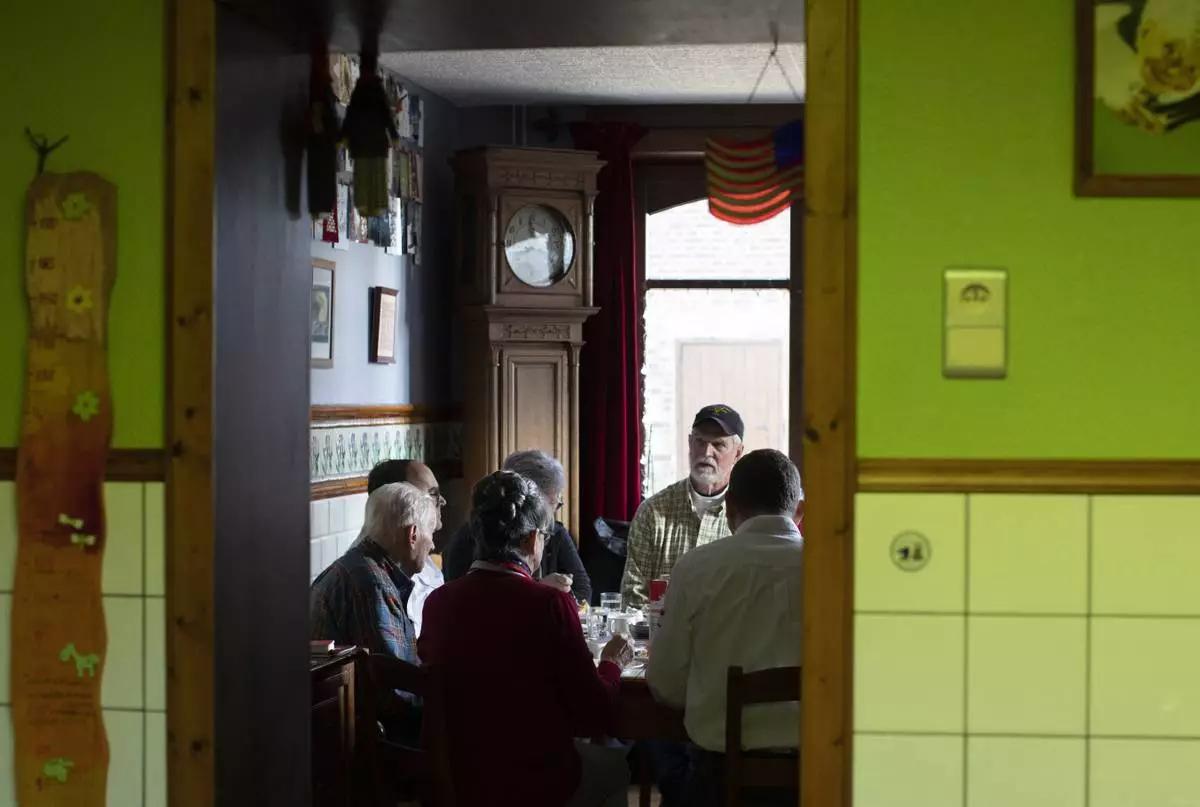 FILE- U.S. Battle of the Bulge veteran Arthur Jacobson, left, and his family have a lunch in the dining room of the WWII Remember Museum 39-45 in Thimister-Clermont, Belgium, Dec. 10, 2019. (AP Photo/Virginia Mayo)