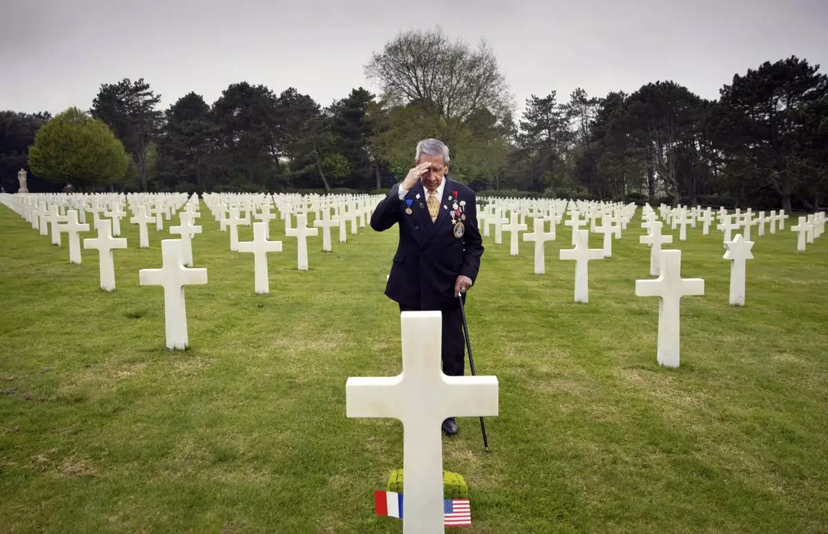 FILE - World War II and D-Day veteran Charles Norman Shay, from Indian Island, Maine, salutes the grave of fellow soldier Edward Morozewicz at the Normandy American Cemetery in Colleville-sur-Mer, Normandy, France, May 1, 2019. (AP Photo/Virginia Mayo, File)