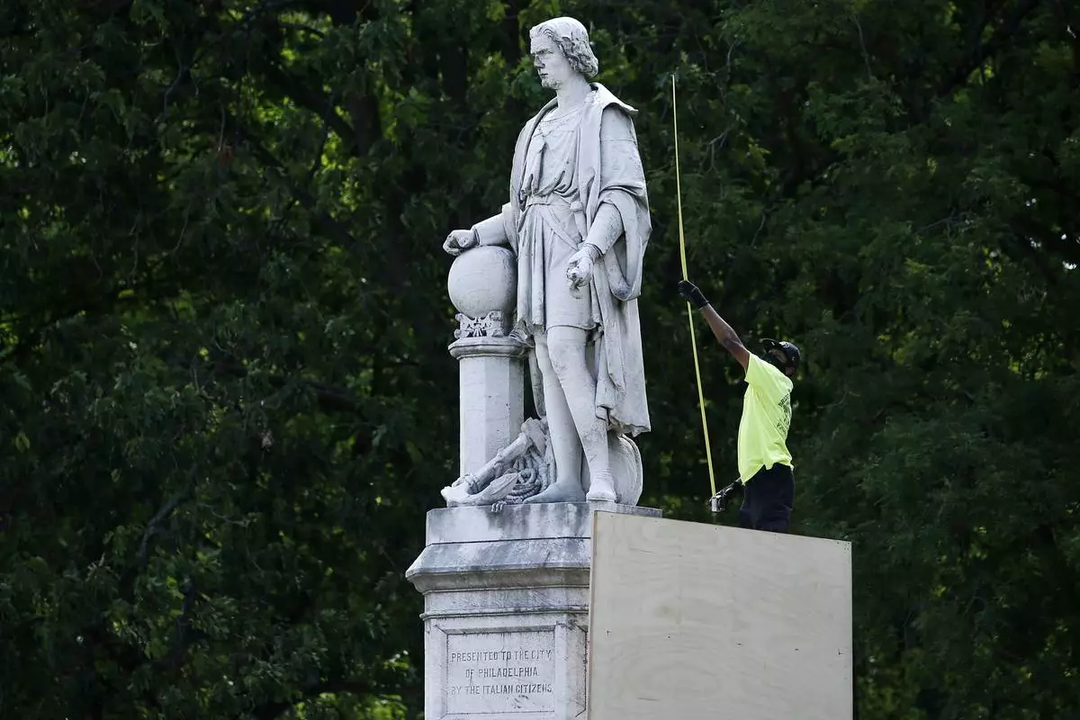 FILE - In this June 16, 2020 file photo, a city worker measures the statue of Christopher Columbus at Marconi Plaza in Philadelphia. (AP Photo/Matt Slocum, File)