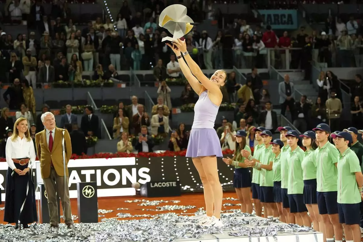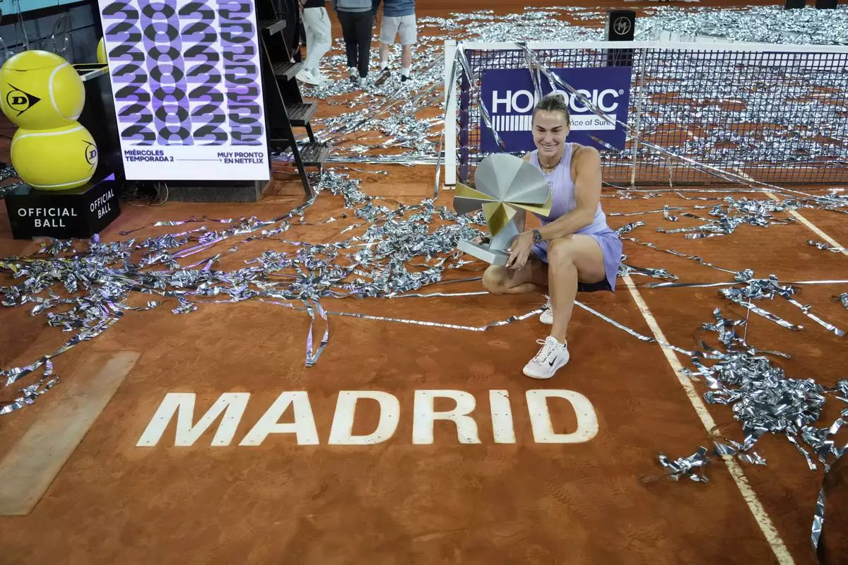MADRID (AP) — No. 1-ranked Aryna Sabalenka beat No. 4 Coco Gauff in straight sets to win her record-tying third Madrid Open and 20th career title on Saturday.