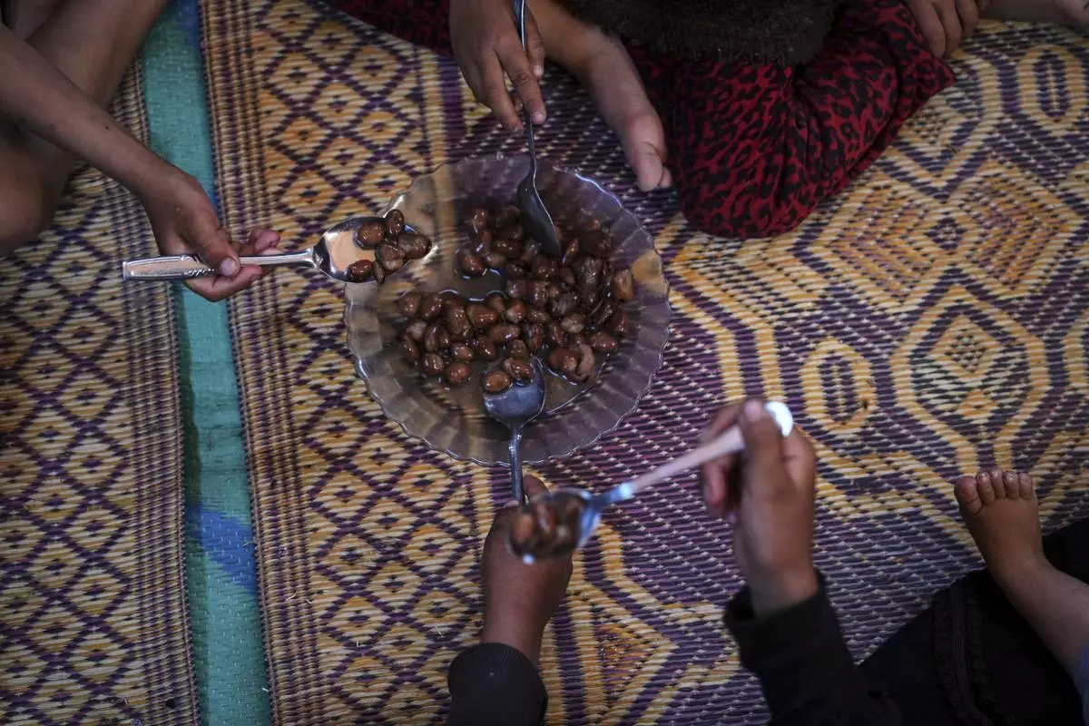 Children of the Abdelaal family share a plate of beans in a tent camp for displaced Palestinians in Mawasi Khan Younis, Gaza Strip, Friday, May 2, 2025. (AP Photo/Abdel Kareem Hana)