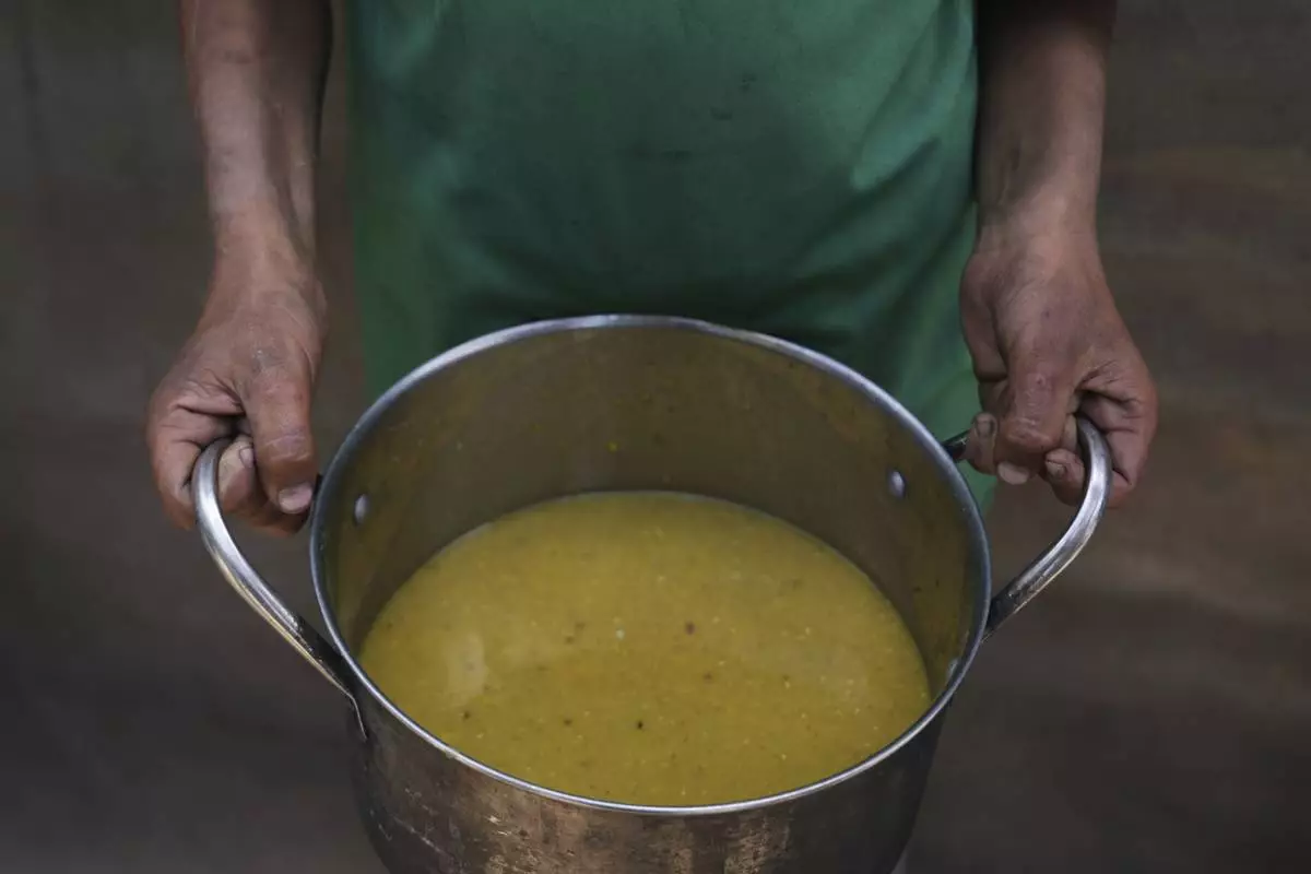 A Palestinian child carries a pot of soup received from a community kitchen in Khan Younis, Gaza Strip, on Saturday, May 3, 2025. (AP Photo/Abdel Kareem Hana)