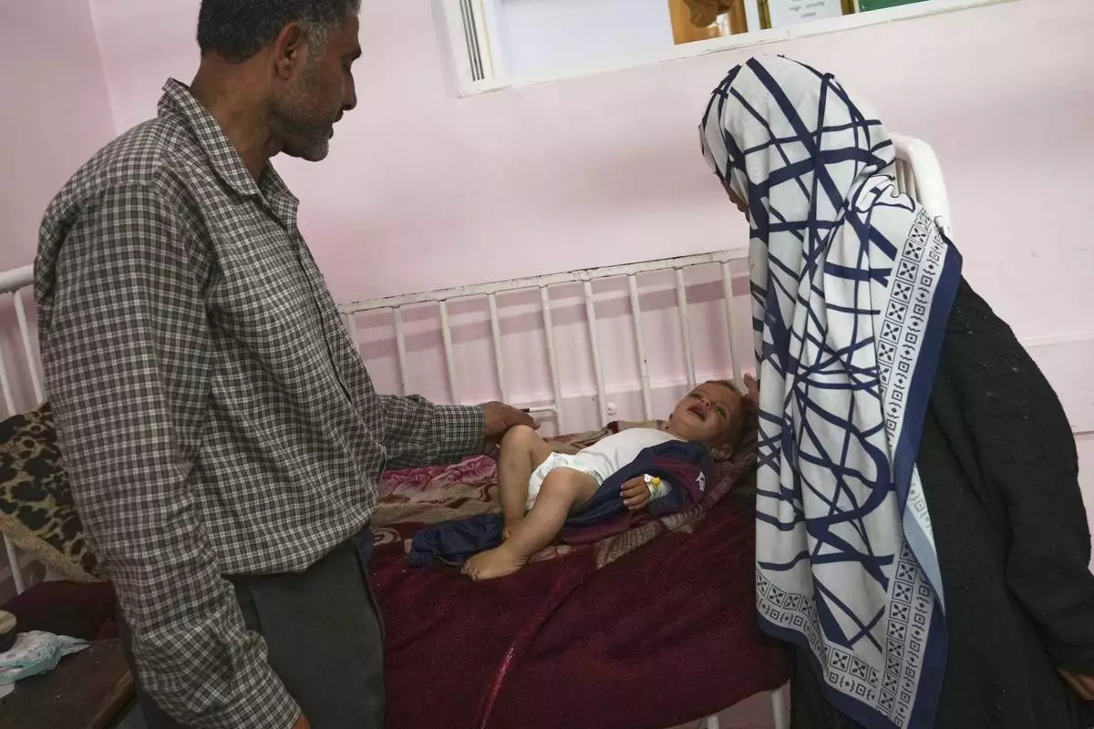 Wedad Abdelaal, right, and her husband Ammar care for their 9-month-old son Khaled, at the malnutrition clinic in Nasser hospital, Khan Younis, Gaza Strip, Thursday, May 1, 2025. (AP Photo/Abdel Kareem Hana)