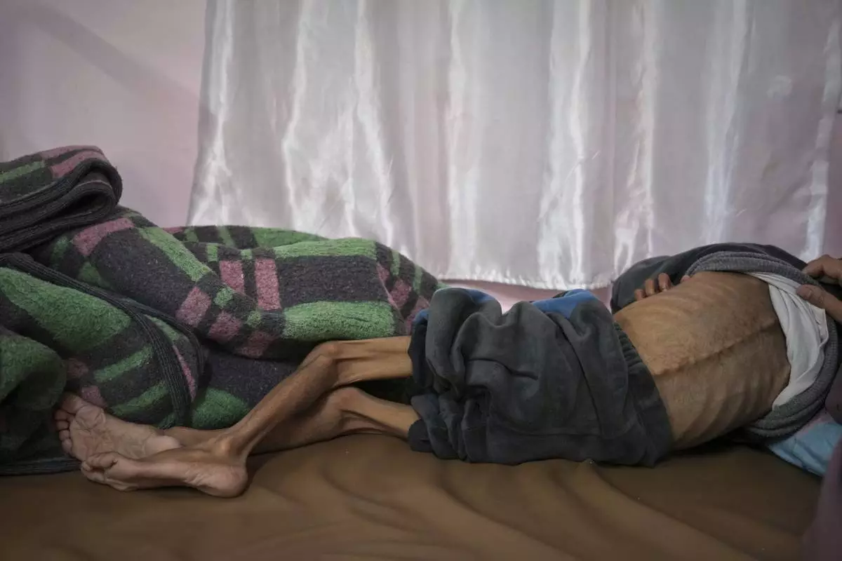 Ahmed El-Sheikh Eid, 7, who shows signs of malnutrition, poses for a photo at his family tent at a camp for displaced Palestinians in Mawasi Khan Younis, Gaza Strip, Friday, May 2, 2025. (AP Photo/Abdel Kareem Hana)