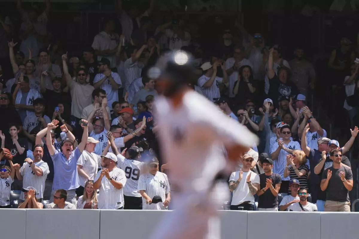 Fans cheer for New York Yankees' Aaron Judge as he runs the bases after hitting a home run during the first inning of a baseball game against the Tampa Bay Rays, Saturday, May 3, 2025, in New York. (AP Photo/Frank Franklin II)