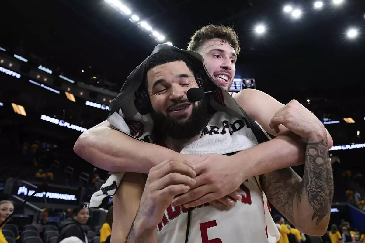 Houston Rockets guard Fred VanVleet (5) is hugged by center Alperen Sengun after the team's victory over the Golden State Warriors in Game 6 of an NBA basketball first-round playoff series Friday, May 2, 2025, in San Francisco. (AP Photo/Godofredo A. Vásquez)