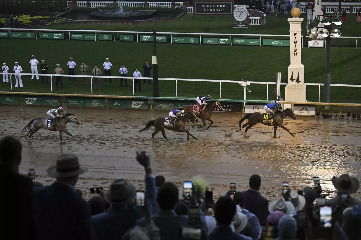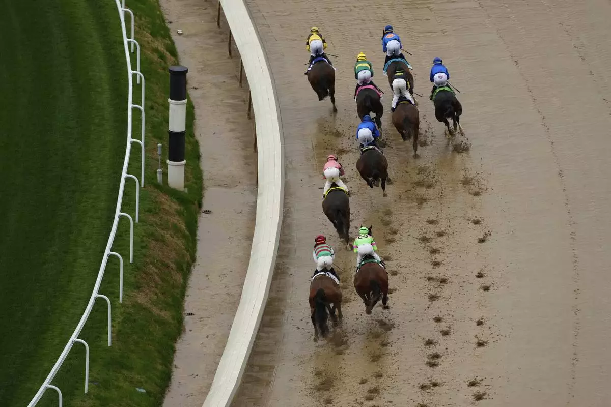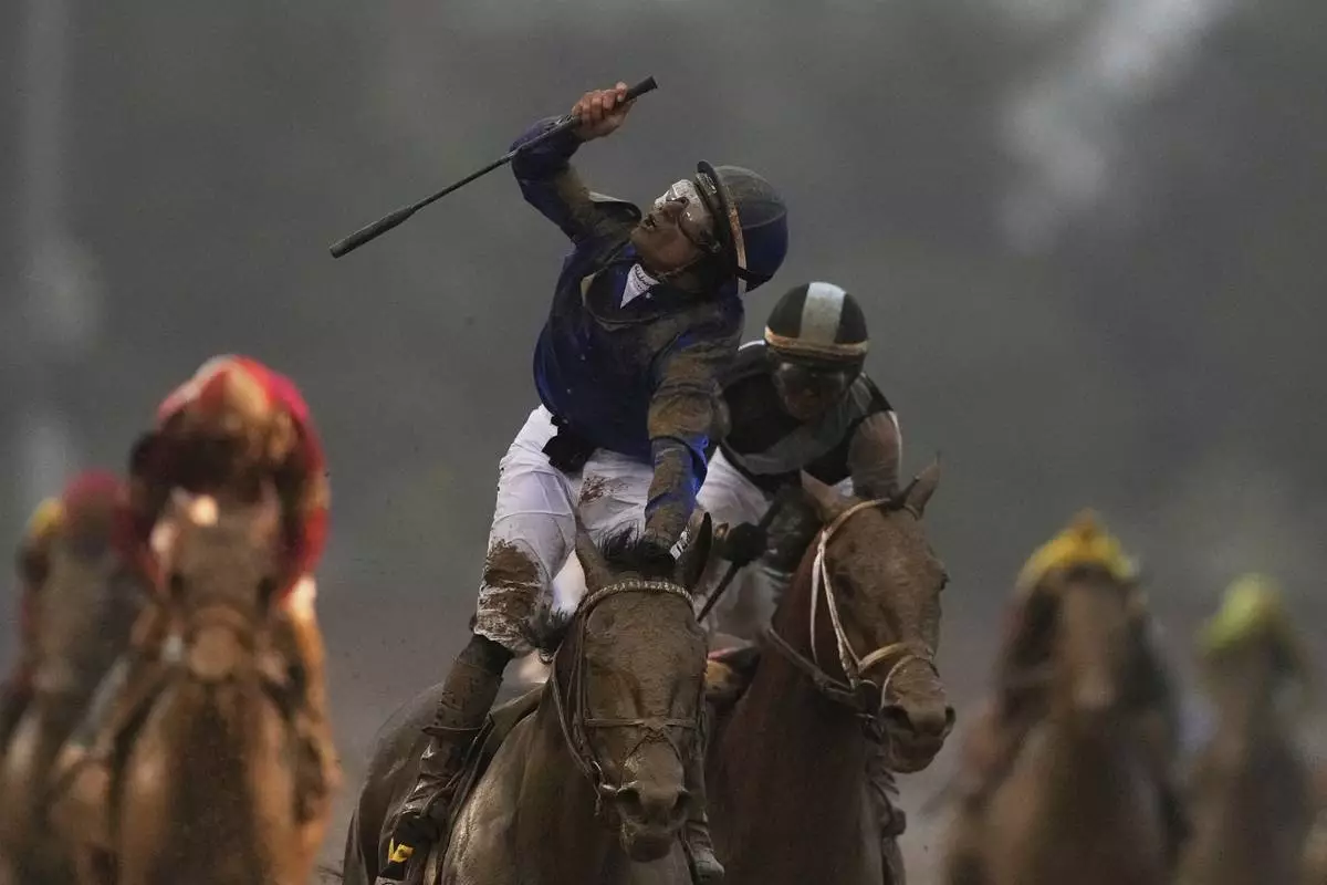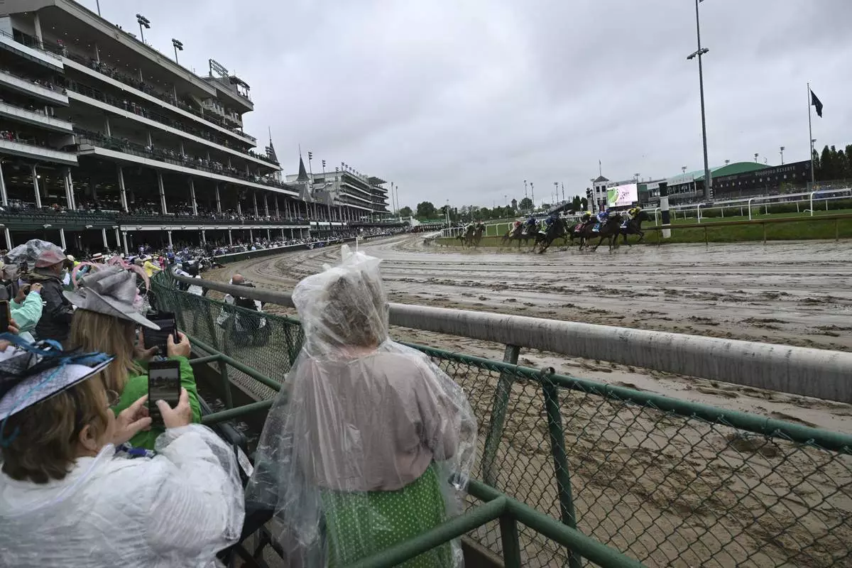 A race is run on a muddy track at Churchill Downs before the 151st running of the Kentucky Derby horse race Saturday, May 3, 2025, in Louisville, Ky. (AP Photo/Charlie Riedel)