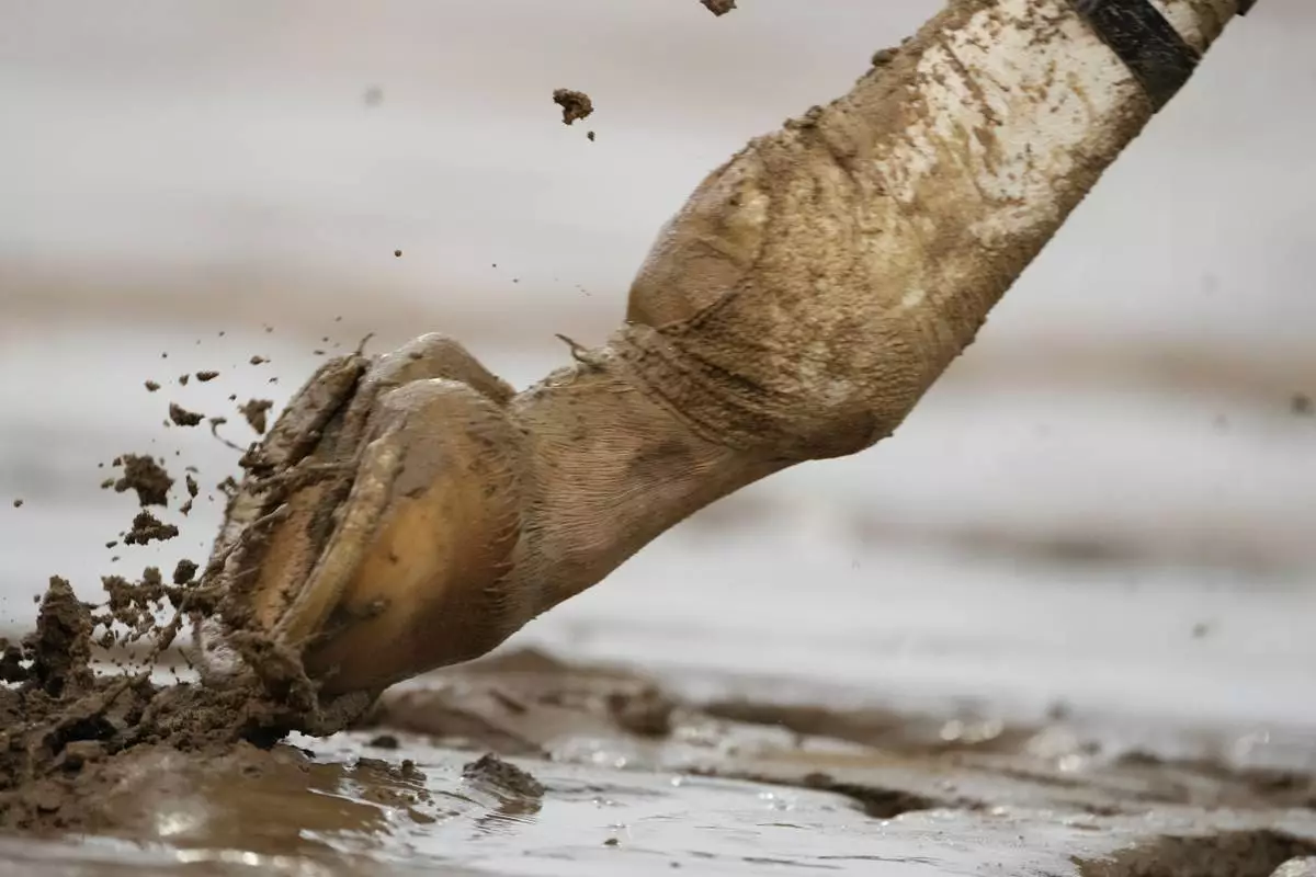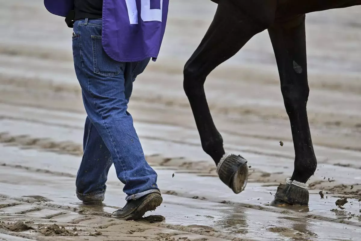 A horse walks on the muddy track at Churchill Downs before the 151st running of the Kentucky Derby horse race Saturday, May 3, 2025, in Louisville, Ky. (AP Photo/Jon Cherry)